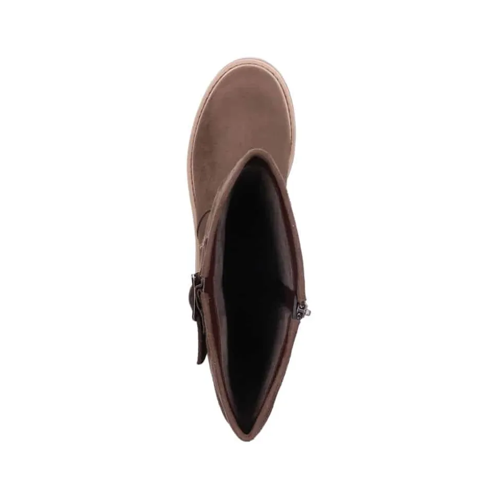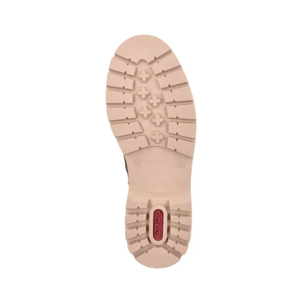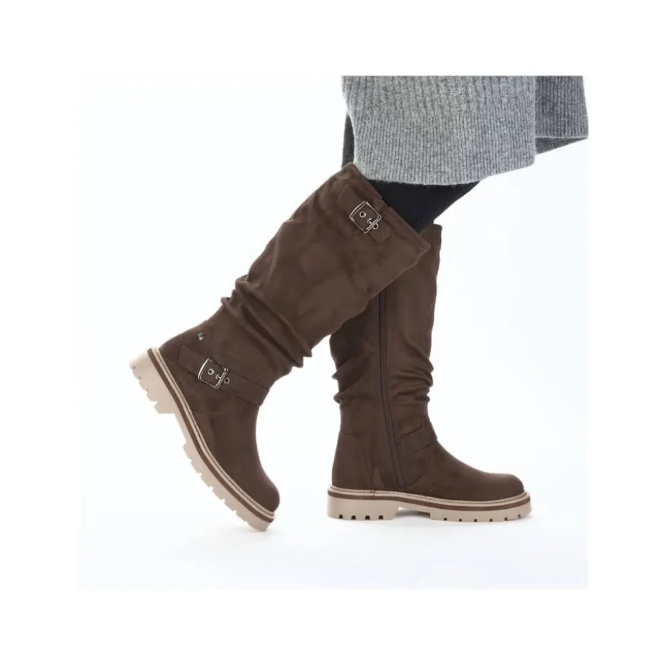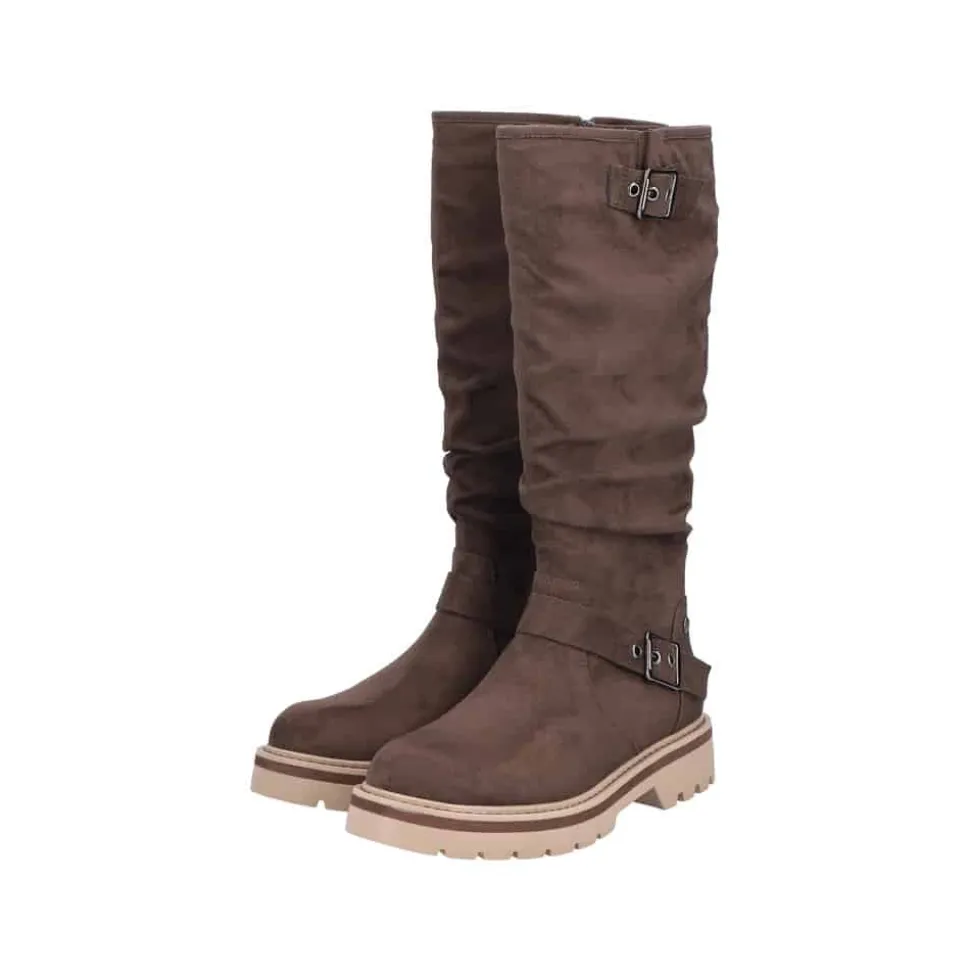 Rieker lang støvle til dame i brun. Stilfuld støvle i brun med flotte spænder og et langt skaft, der giver et moderne udtryk. Støvlen er udstyret med en funktionel lynlås på indersiden, som gør den nem at tage af og på. Indvendigt finder du en let foring og en blød sål, der sikrer høj komfort hele dagen. Den chunky ydersål med stødabsorberende egenskaber og et godt mønster giver øget støtte og skridsikkerhed.