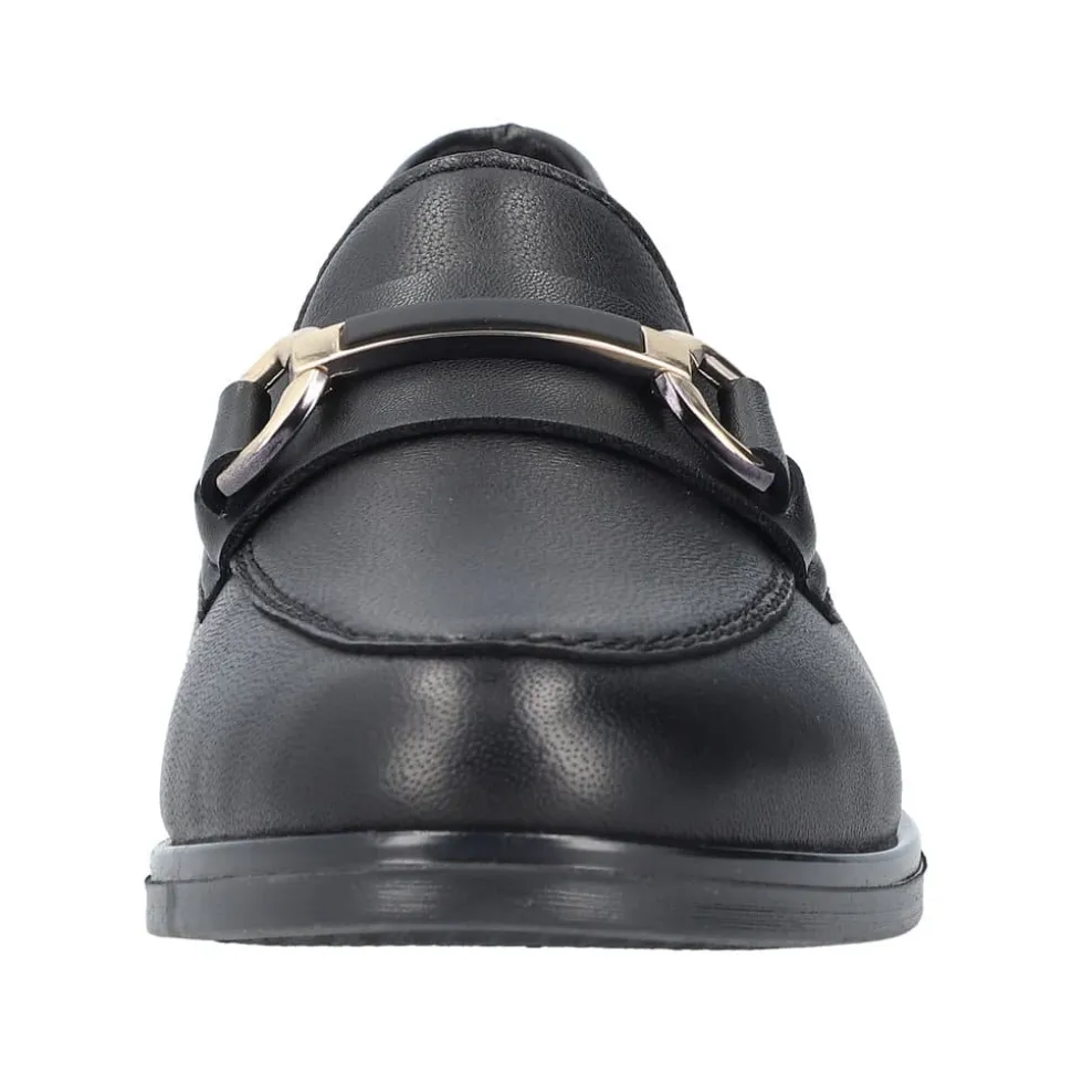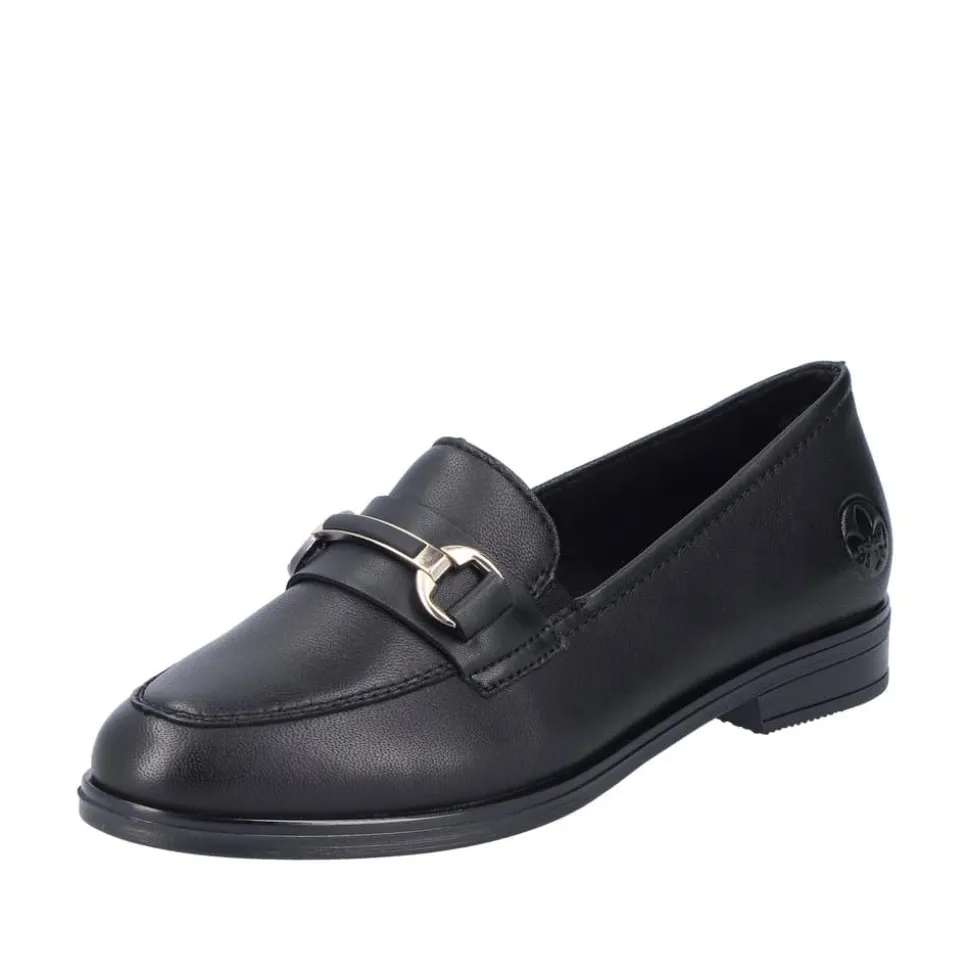 Rieker loafers til dame i sort. Denne elegante loafers kommer i en klassisk sort farve med fine detaljer. Skoen er lavet af 100% skind udvendigt og har en blød skind indersål. Modellen er let at tage på og har elastik for en god pasform. Den flotte guldkæde over forfoden tilføjer et ekstra strejf af stil. Med stødabsorberende såler sikres optimal komfort hele dagen. Skoen har også en lille hæl, som giver den et elegant udtryk. Den sorte ydersål har et godt mønster for øget skridsikkerhed.