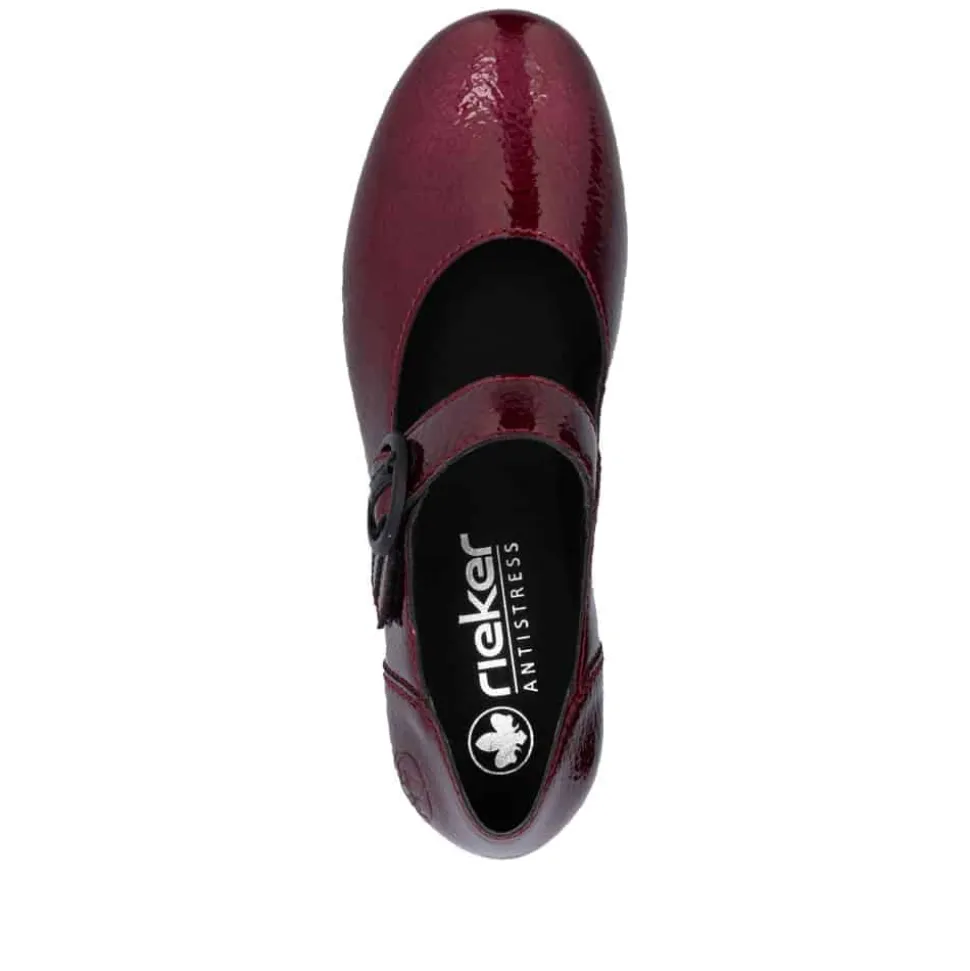 Rieker pumps til dame i rød lak. Disse pumps kombinerer komfort og stil med en skinnende lakoverdel, der giver et elegant udtryk. Skoen er nem at tage på takket være en praktisk velcrolukning over forfoden, som samtidig giver mulighed for at justere pasformen. Indvendigt sørger en blød indersål for komfort hele dagen. Blokhælen på ca. 4,5 cm giver et flot løft, mens ydersålen med mønster og stødabsorbering sikrer stabilitet og støtte.