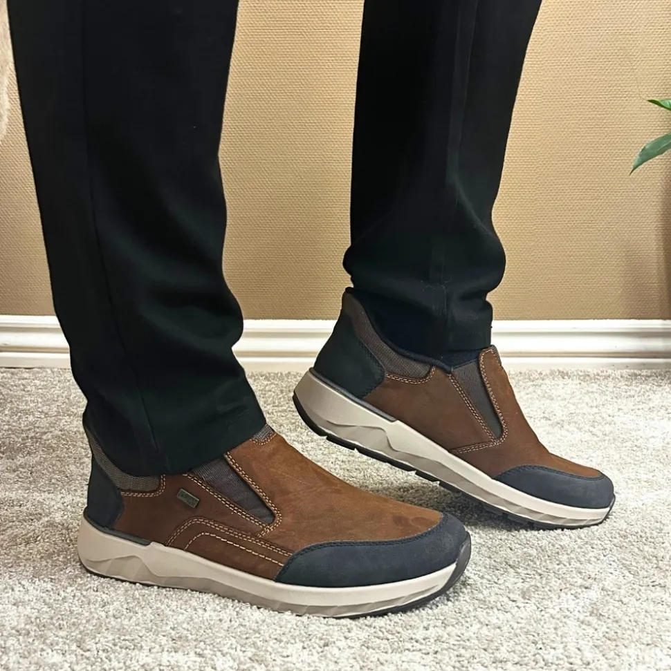 Rieker Ready 2 Go hyttesko til herre i brun. Flot hyttesko til herre i brun skind, der kombinerer komfort og funktionalitet. Modellen er udstyret med Ready 2 Go teknologi og en fast hælkappe, så du nemt kan tage skoen på uden brug af hænder. Indvendigt sørger en blød udtagelig sål og ekstra bredde (H) for høj komfort og fleksibilitet. Med Rieker-Tex er skoen kraftigt vandafvisende, og den solide ydersål med mønster giver både øget stødabsorbering og skridsikkerhed.