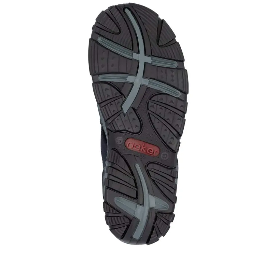 Rieker Ready 2 Go sandal til dame i mørkeblå. Komfortabel og let sandal i en smuk mørkeblå farve, der kombinerer stil og funktionalitet. Med Hands Free Ready 2 Go teknologien og en fast hælkappe kan sandalen nemt tages af og på uden brug af hænder. Den bløde indersål med Rieker Antistress-teknologi sikrer behagelig komfort hele dagen, mens den solide ydersål er mønstret for ekstra skridsikkerhed.