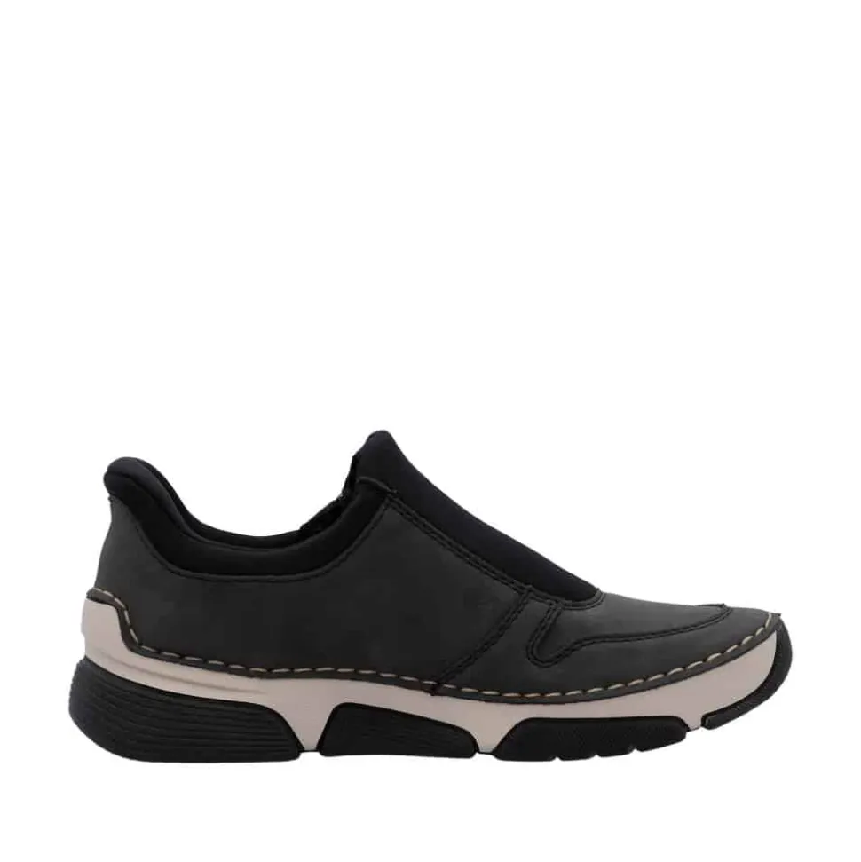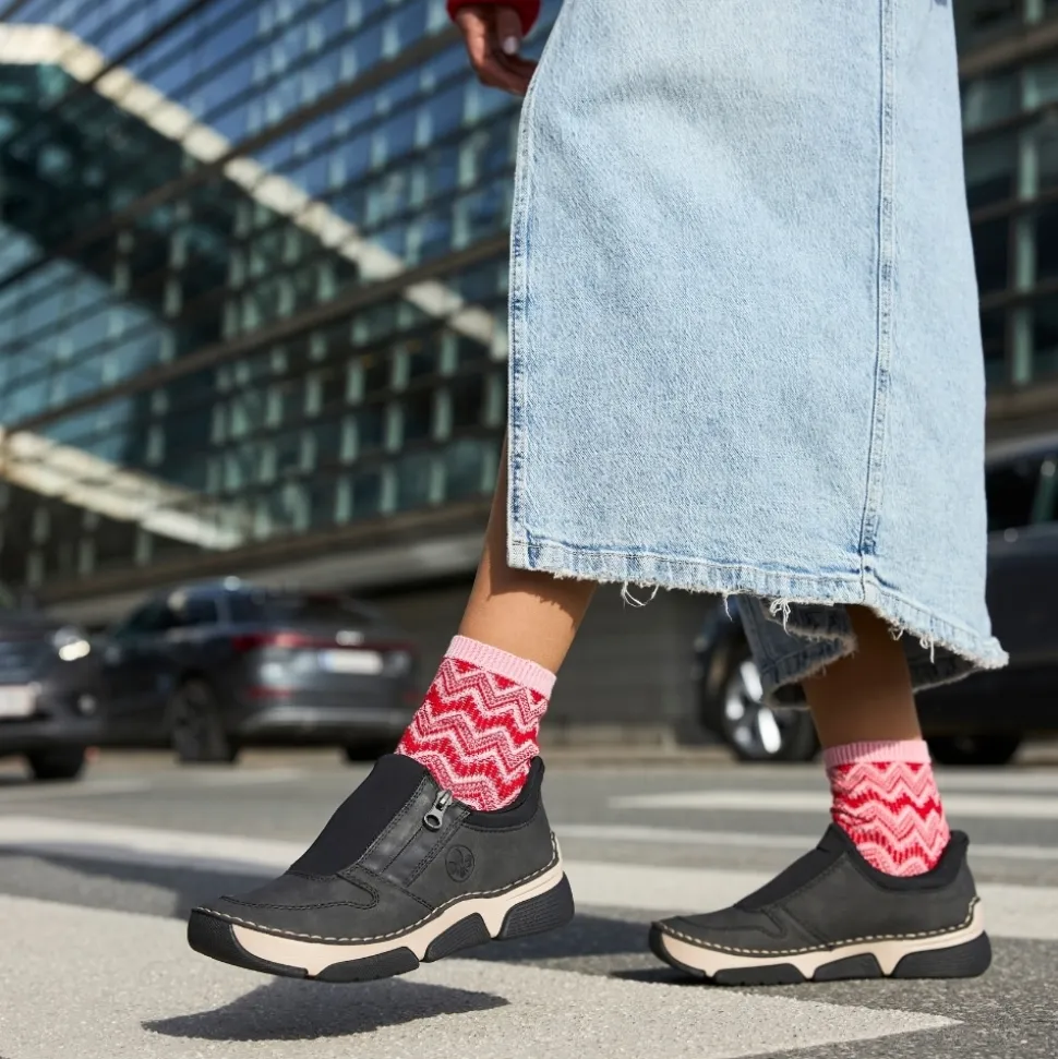 Rieker Ready 2 Go sko til dame i grå og sort. Moderne sko til dame i sort og grå med smarte detaljer. Skoen er udstyret med Ready 2 Go-teknologi og en fast hælkappe, som gør det nemt at komme i og af skoen uden brug af hænder. På siden har skoen en funktionel lynlås, der tilføjer både stil og funktion. Indvendigt bliver du mødt af en blød udtagelig indersål i skind, som giver god komfort dagen lang. Skoen er let og fleksibel, og ydersålens mønster er med til at øge både stødabsorbering og skridsikkerhed.