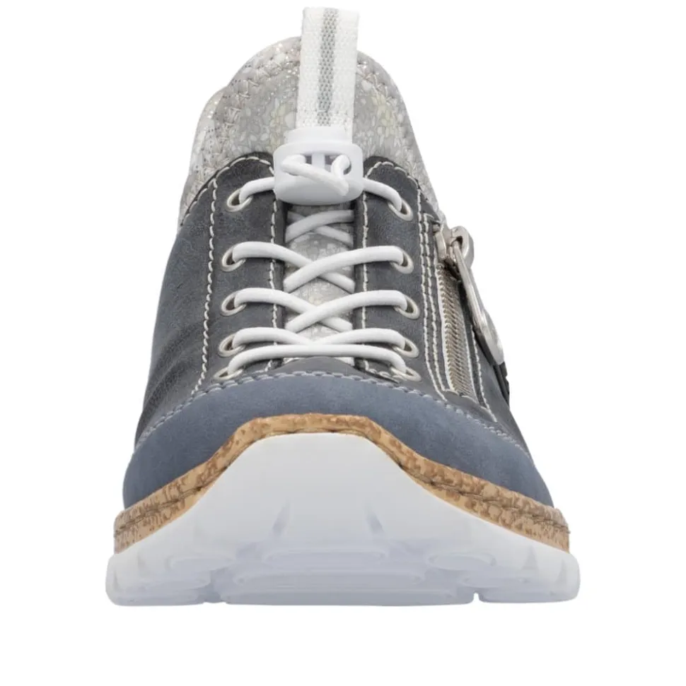 Rieker Ready 2 Go sneakers til dame i lyseblå. Populær sneakers i en moderne blå farve, der pyntes af fine detaljer ved åbningen. Skoen er udstyret med den innovative Hands Free Ready 2 Go teknologi, der takket være den faste hælkappe, gør det nemt at komme i og af skoen uden brug af hænder. Desuden har skoen elastik foran der gør det muligt at justere pasformen efter dine behov. Indvendigt bliver du mødt af en dejlig blød memosoft sål, der sikrer optimal komfort dagen lang. Ydersålen er god og solid samt udstyret med stødabsorberende egenskaber samt øget skridsikkerhed, takket være det gode mønster under sålen.