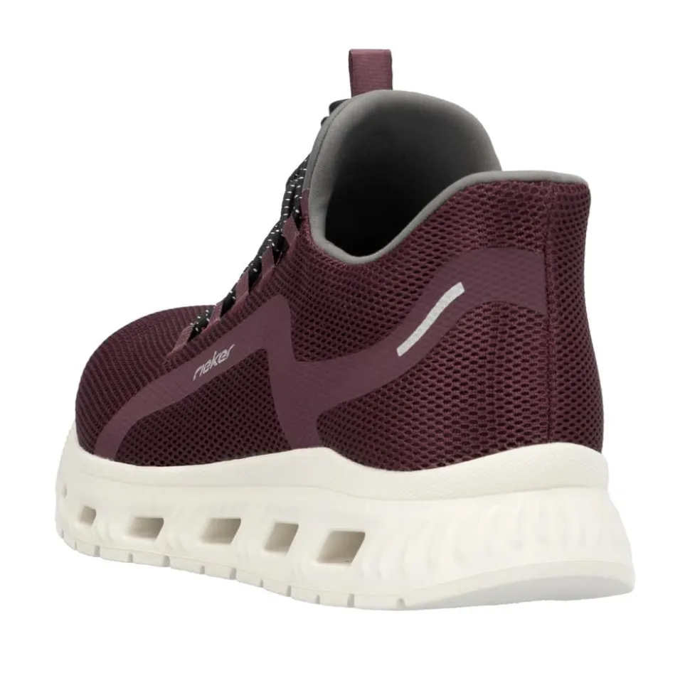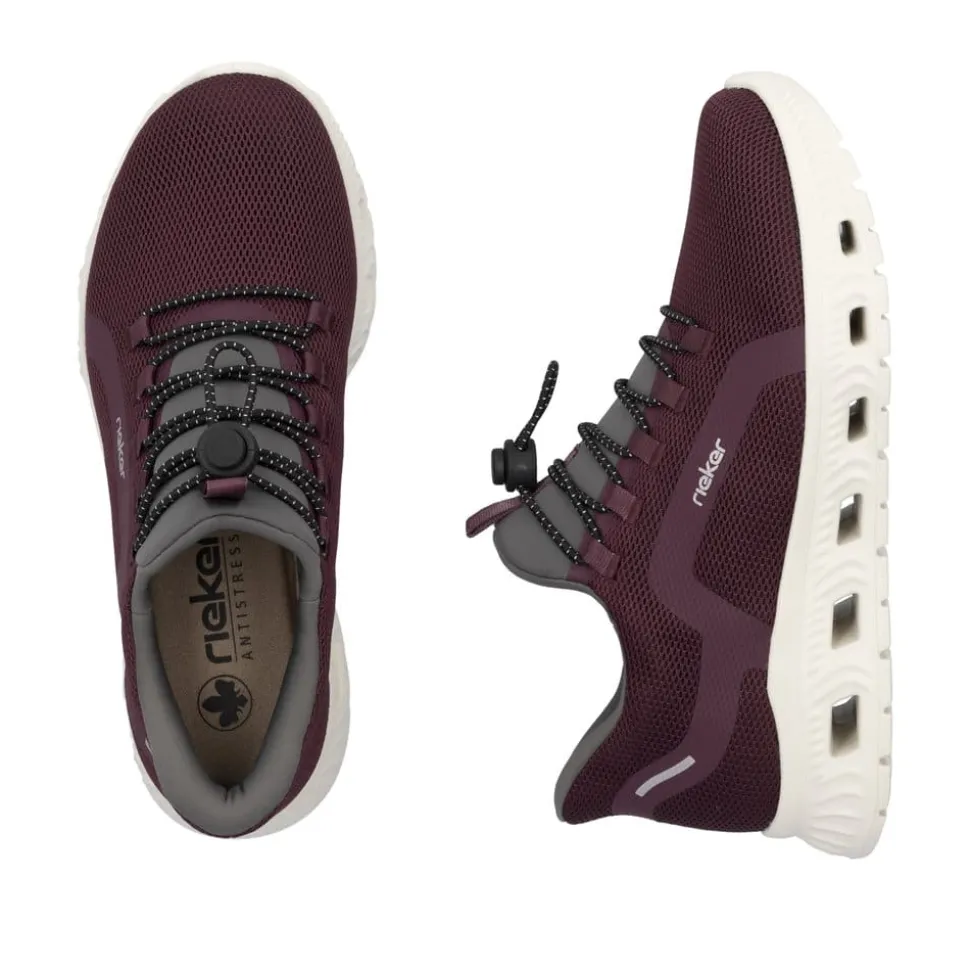 Rieker Ready 2 Go sneakers til dame i rød/bordeaux. Denne sneakers fra Rieker er udviklet med den innovative Hands Free Ready 2 Go teknologi, som gør det hurtigt og nemt at få skoene på uden at bruge hænder, takket være den faste hælkappe. Det bliver ikke lettere end dette! Modellen indeholder også den populære Rieker Antistress-teknologi, der sikrer fleksibilitet og stødabsorbering ved hvert skridt og bløde Memosoft såler. Den elastiske åbning og snørebåndet sikrer en perfekt pasform til din fod. Bestil disse Ready 2 Go sneakers til damer fra Rieker i dag og oplev komforten selv, når du kan tage skoene på uden brug af hænder!