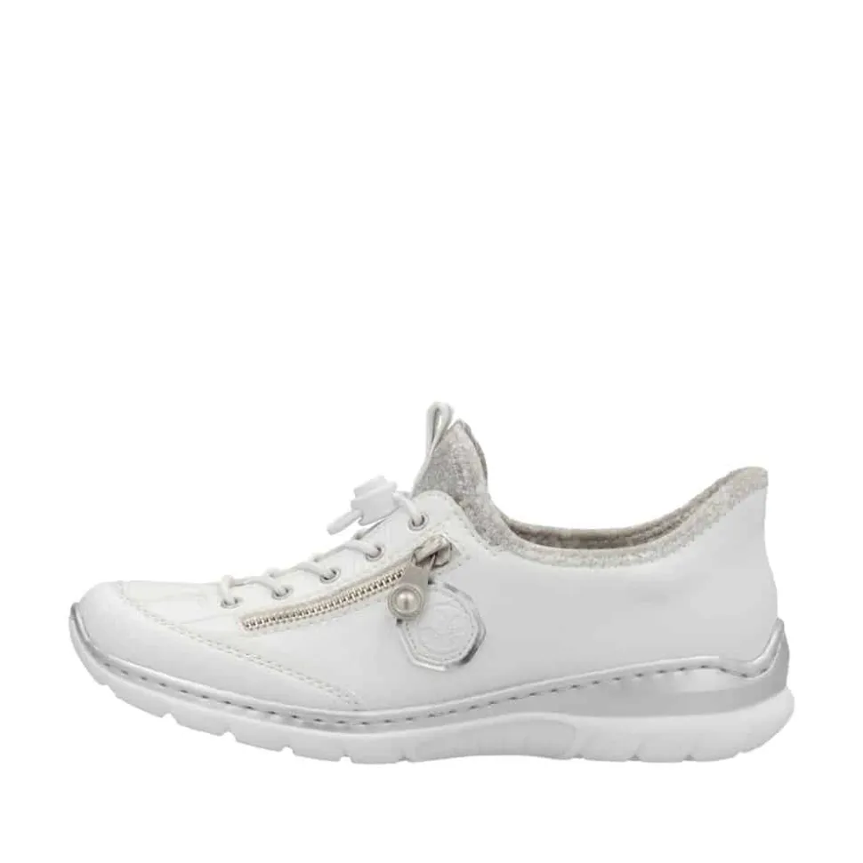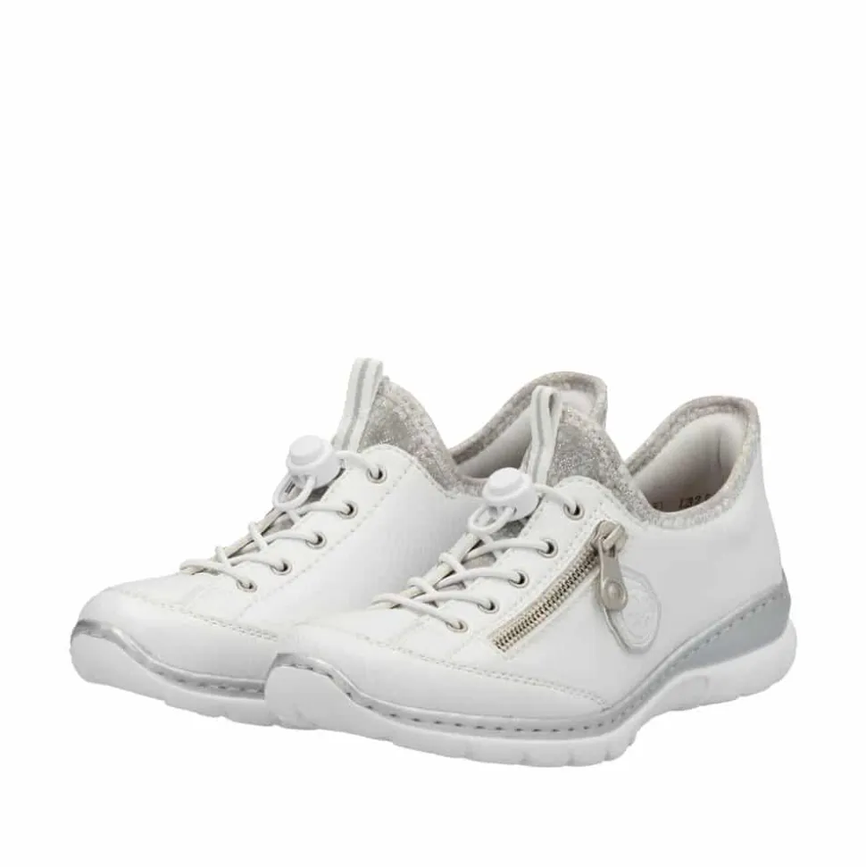 Rieker Ready 2 Go sneakers til dame i hvid. Med Ready2GO-teknologien kan du nemt træde i skoene uden at bøje dig ned eller bekymre dig om slid på hælkappen, hvilket gør dem til et praktisk og stilfuldt valg. Den ekstra bløde Memosoft-indlægssål former sig efter din fod for en skræddersyet komfort, der varer hele dagen. Overdelen er fremstillet i slidstærkt kunstlæder, mens den åndbare tekstilforing holder dine fødder friske og behagelige. Elastikbåndene gør det unødvendigt at binde snørebånd, hvilket gør dem perfekte til både hverdag og afslappede aktiviteter. Et ideelt valg for dig, der ønsker en kombination af funktionalitet og moderne design.