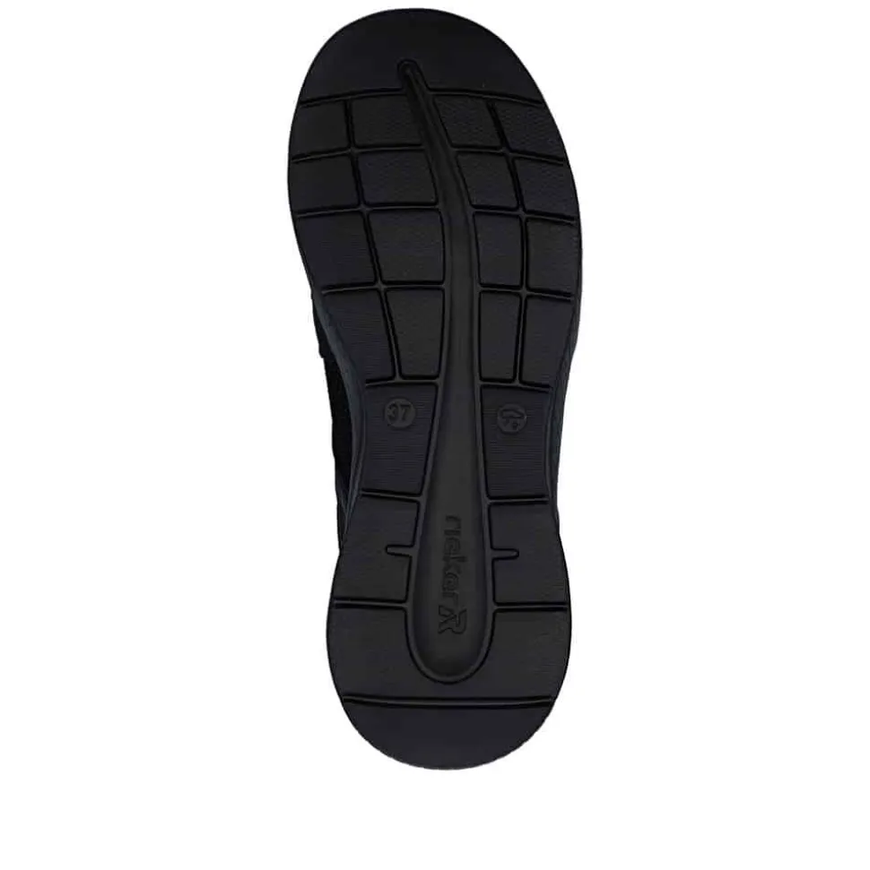 Rieker Ready 2 Go sneakers til dame i sort. Denne sorte sneakers kombinerer et pænt udtryk med god komfort til hverdagen. Elastikken foran gør at skoen sidder godt på foden, mens Rieker Ready 2 Go teknologien sammen med den faste hælkappe gør det muligt at tage skoen på uden brug af hænder. Indvendigt er skoen udstyret med en blød og udtagelig Rieker-Soft sål som giver behagelig komfort hele dagen. Rieker-Tex gør skoen kraftigt vandafvisende, og Rieker-Light+ ydersålen giver både lethed, fleksibilitet og effektiv stødabsorbering.