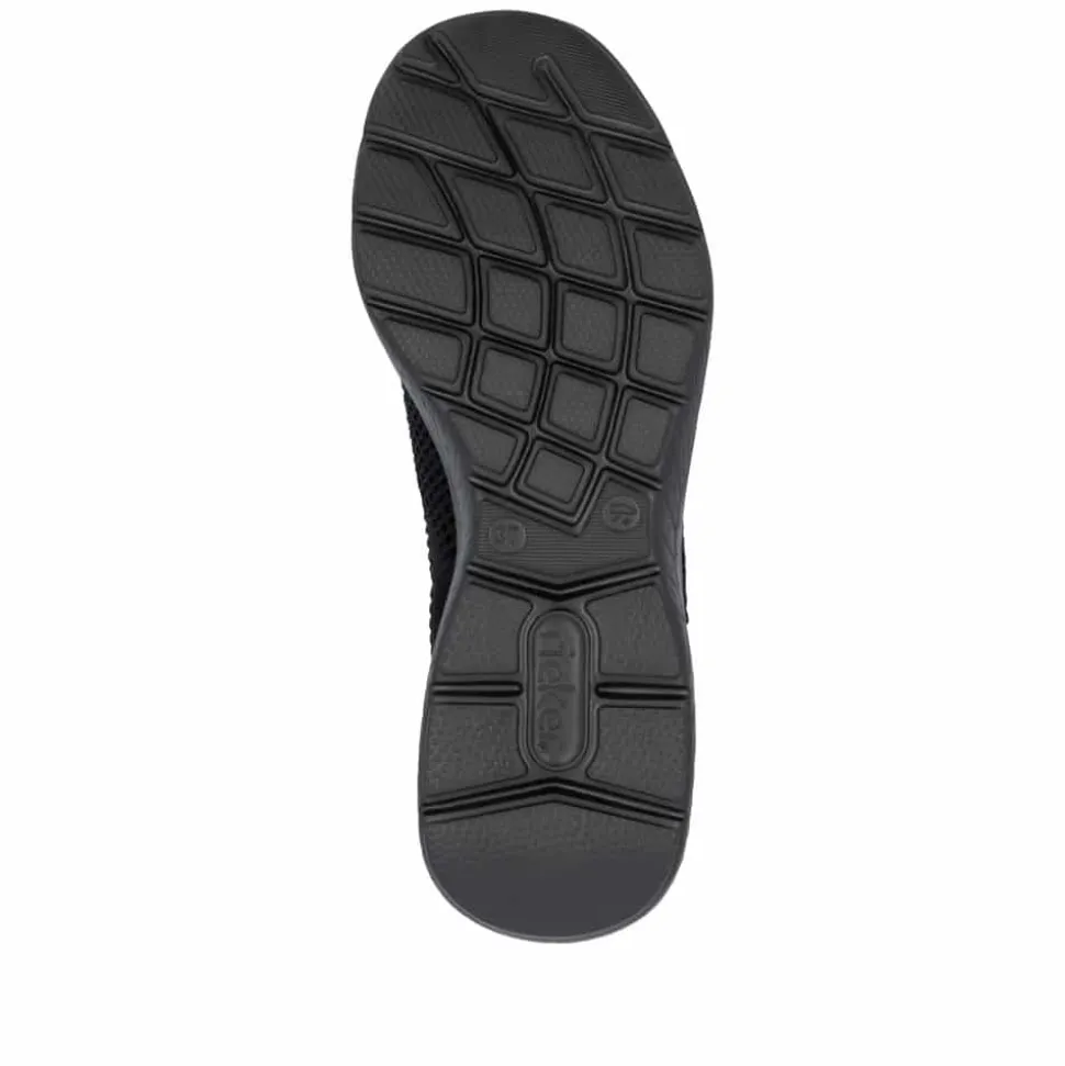 Rieker Ready 2 Go sneakers til dame i sort. Moderne sneakers i sort med flotte detaljer og elastik foran, der sikrer en fleksibel og behagelig pasform. Skoen er udstyret med Hands Free Ready 2 Go teknologi og en fast hælkappe, så du nemt kan tage skoen på uden at bruge hænder. Indvendigt finder du en blød memosoft sål, som giver maksimal komfort hele dagen. Ydersålen er stødabsorberende og har et mønster, der giver øget stabilitet og skridsikkerhed.