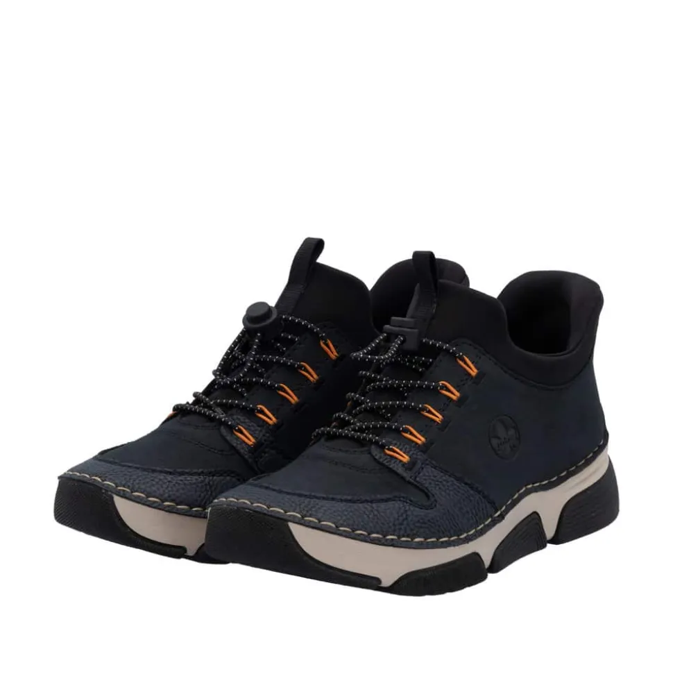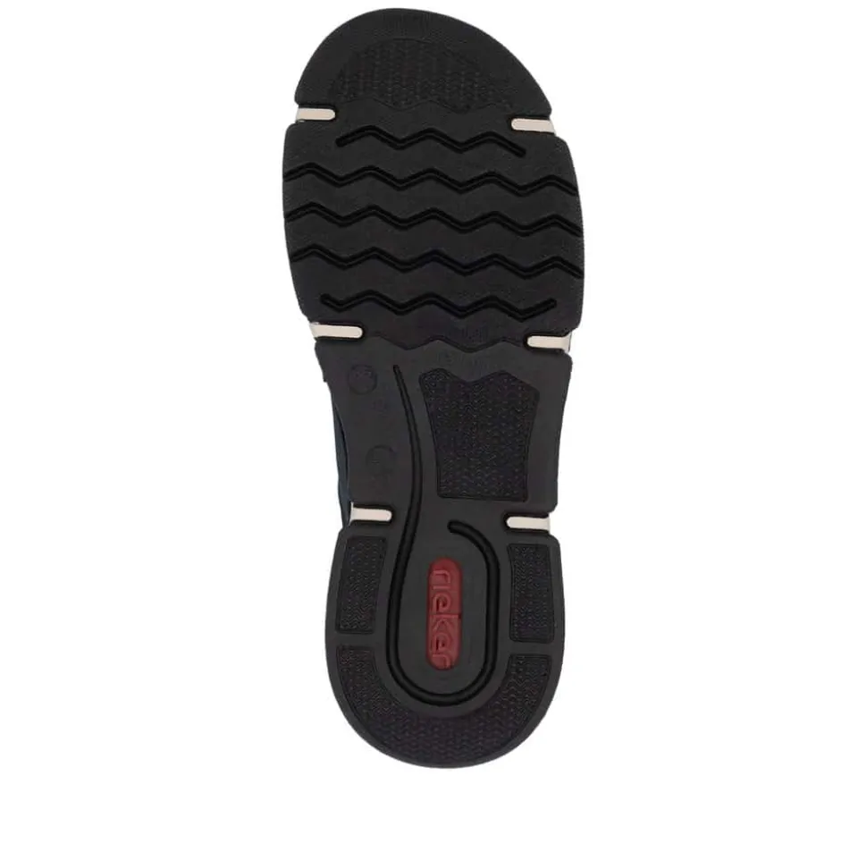 Rieker Ready 2 Go sneakers til dame i blå. Smarte sneakers med Ready 2 Go-teknologi og en fast hælkappe, der gør det nemt at tage skoen af og på uden brug af hænder. Foran har skoen en justerbar elastik, som sikrer en god pasform. Indvendigt bliver du mødt af en udtagelig blød skindsål, der giver komfort hele dagen. Med Rieker Antistress får du øget stødabsorbering og fleksibilitet.