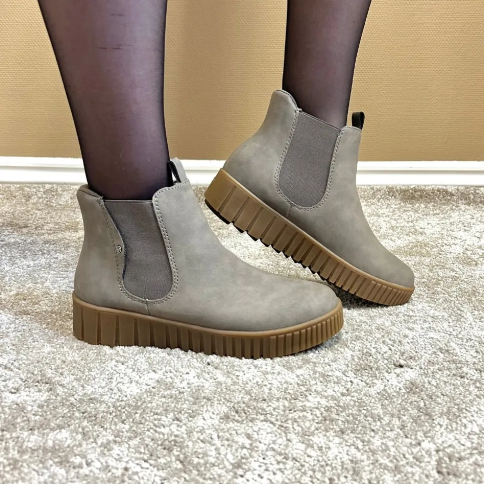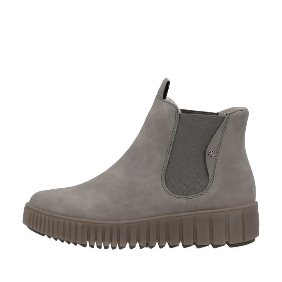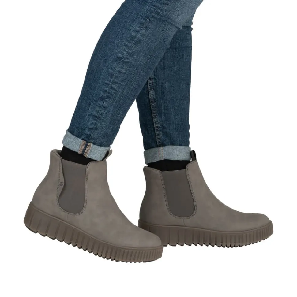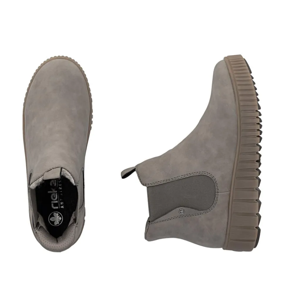 Rieker Ready 2 Go støvle til dame i grå. Flot grå støvle, perfekt til dig der ønsker både stil og komfort. Med Ready 2 Go teknologien og en fast hælkappe kan støvlen tages på uden brug af hænder. Indvendigt finder du en varm foring og en blød udtagelig sål, som giver behagelig komfort hele dagen. Mens den mønstrede ydersål på 4 cm giver øget stødabsorbering og skridsikkerhed.