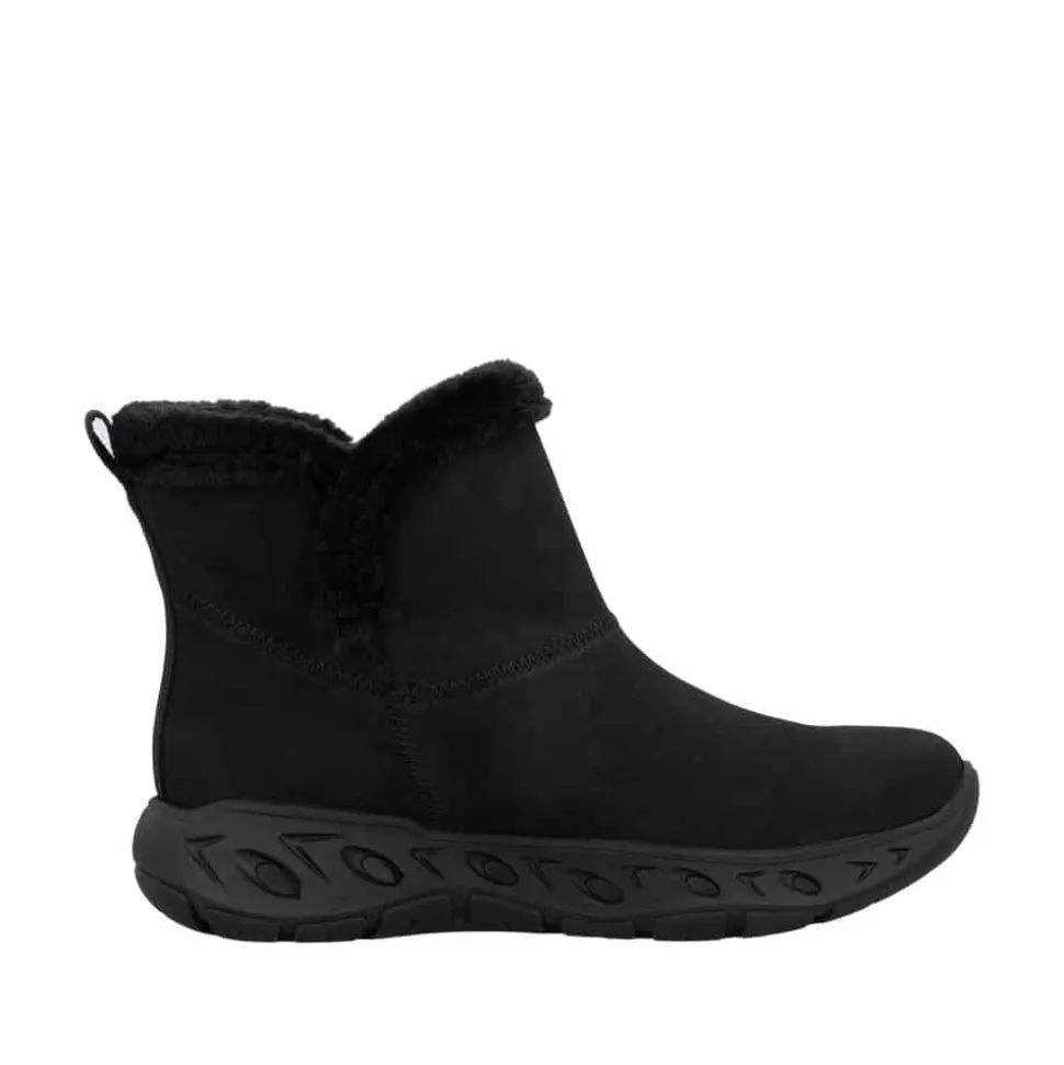 Rieker Ready 2 Go støvle til dame i sort. Smart sort støvle, der på bedste vis kombinerer stil og funktionalitet. Med Ready 2 Go teknologi og en fast hælkappe kan du tage støvlen på uden brug af hænder, hvilket gør støvlen både praktisk og nem i hverdagen. Indvendigt sørger den varme foring og den bløde Memosoft sål for en behagelig komfort hele dagen. Støvlen er desuden udstyret med Rieker-Tex, som gør støvlen kraftig vandafvisende, mens den mønstrede ydersål giver øget stødabsorbering og skridsikkerhed.