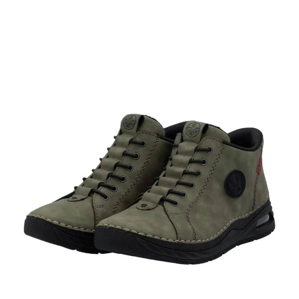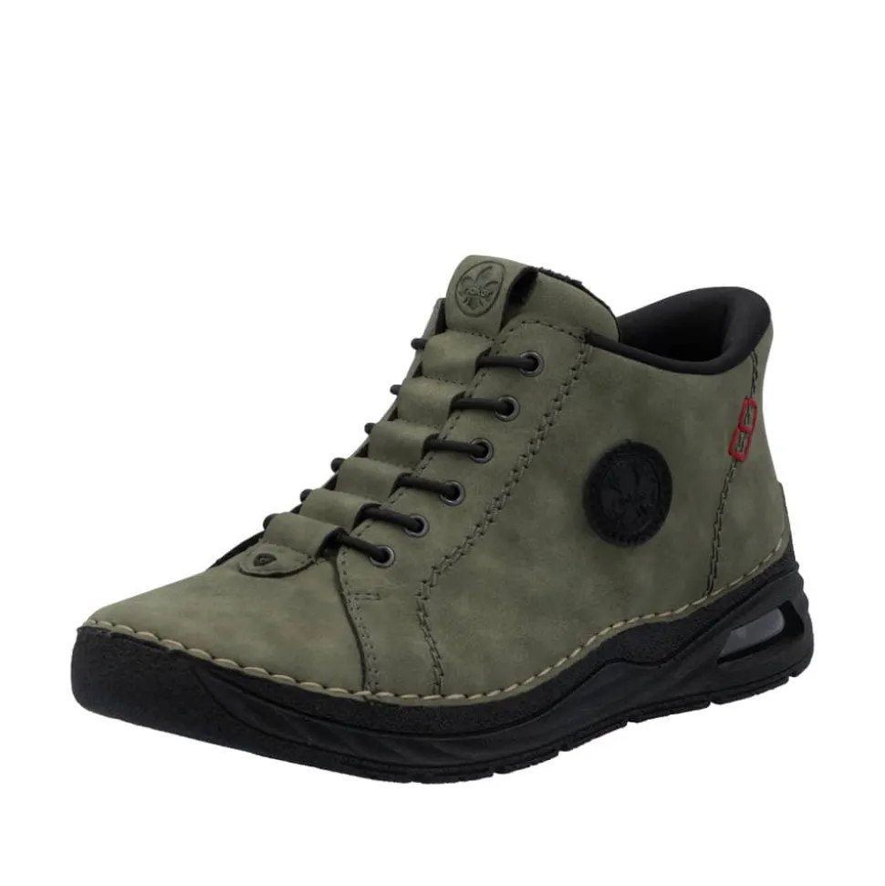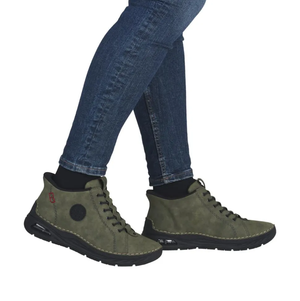 Rieker Ready 2 Go støvle til dame i army grøn. Smart og funktionel støvle i army grøn, der er ideel til hverdagen. Den er designet med Ready 2 Go-teknologi og en fast hælkappe, så du nemt og hurtigt kan tage den på uden hænder. Den elastiske front tilpasser sig foden og giver ekstra komfort. Indvendigt er støvlen let foret og har en udtagelig sål, mens den mønstrede ydersål sørger for øget skridsikkerhed og stødabsorbering.