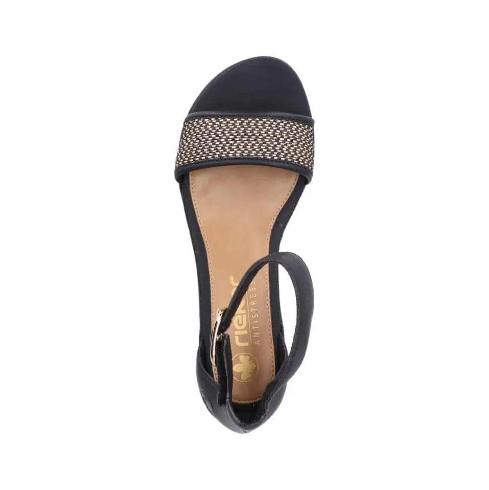 Rieker sandal til dame i sort. Denne elegante sandal i klassisk sort får et stilfuldt udtryk med det flotte guldfarvede mønster på remmen over forfoden. Velcroremmen omkring anklen, pyntet med en smuk gylden spænde, gør sandalen nem at tage af og på, samtidig med at den sikrer en god pasform. Indvendigt sørger en blød indersål for komfort hele dagen, mens blokhælen på ca. 4,5 cm giver et elegant løft. Ydersålen med stødabsorbering og rillet mønster sikrer stabilitet og skridsikkerhed.