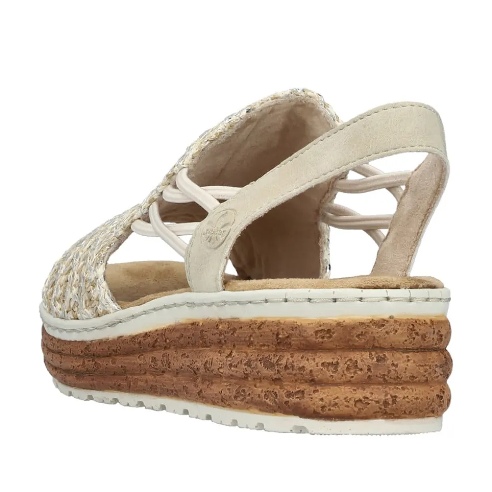 Rieker sandal til dame i beige. Elegant damesandal i beige med et smukt sølvfarvet mønster på forfoden, der giver et moderne og sofistikeret look. Sandalen har en bred rem med elastik i siderne, som forbinder den elegant med en hælrem. Denne elastiske detalje gør sandalen nem at tage af og på, samtidig med at den sikrer en fleksibel og behagelig pasform. Den bløde indersål er designet med ekstra bredde (H), hvilket giver optimal komfort og god rummelighed. Med en stødabsorberende plateausål på 4,5 cm får du et stilfuldt løft, mens den skridsikre ydersål sørger for stabilitet hele dagen.