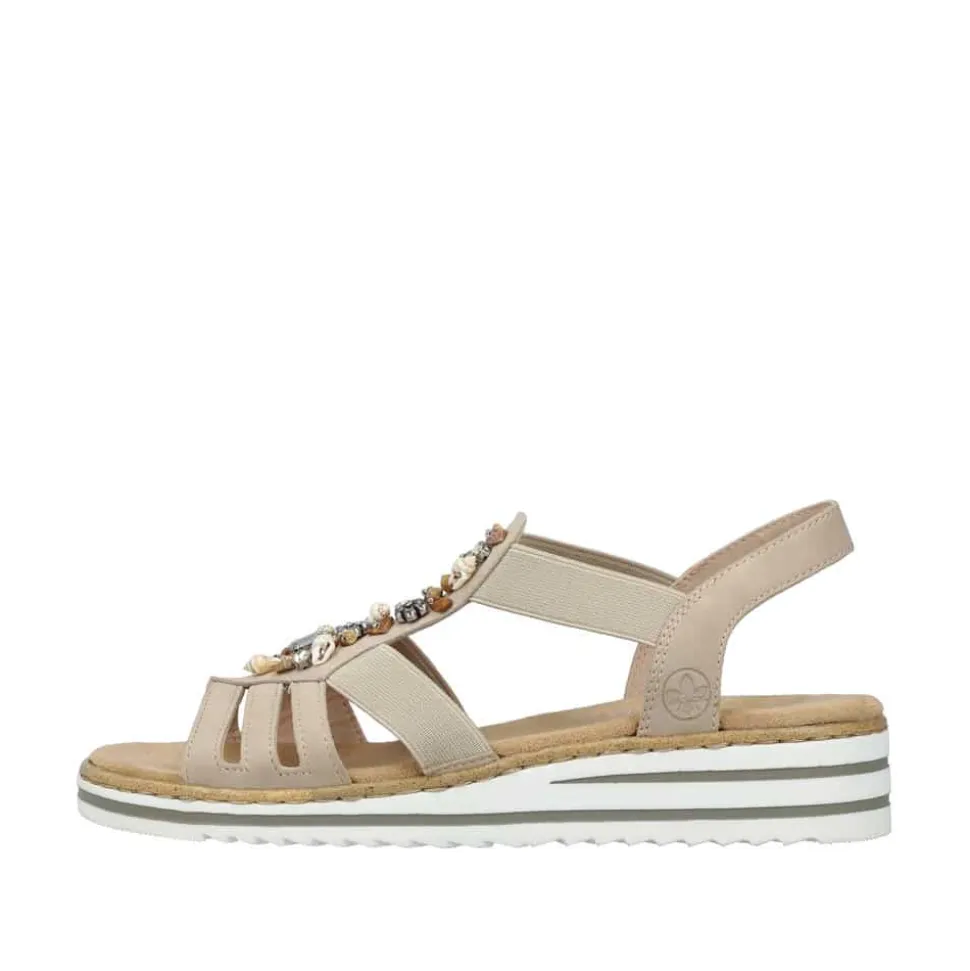 Rieker sandal til dame i beige/sand. Vælg Rieker kilesandalerne for at være et skridt foran! De cremefarvede sandaler skaber det perfekte statement og sætter et uforglemmeligt præg! Med en elastikindsats er de nemme at tage på og af. Den midterste rem, udsmykket med elegante detaljer, fuldender det moderne design til perfektion. En let og støddæmpende sål sikrer en behagelig gåoplevelse, mens den ekstra bløde indlægssål tilføjer en ekstra dosis komfort. Takket være den smalle E 1/2 pasform sidder sandalen behageligt tæt uden at stramme.