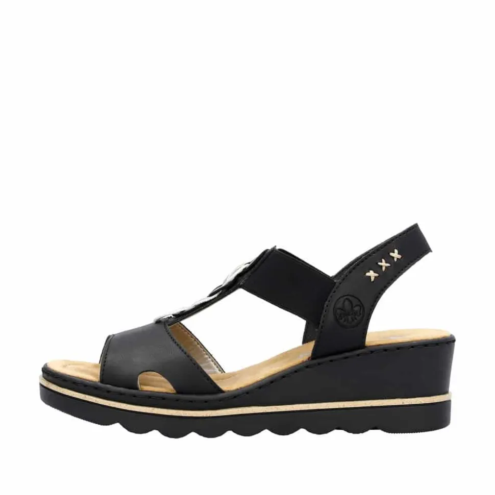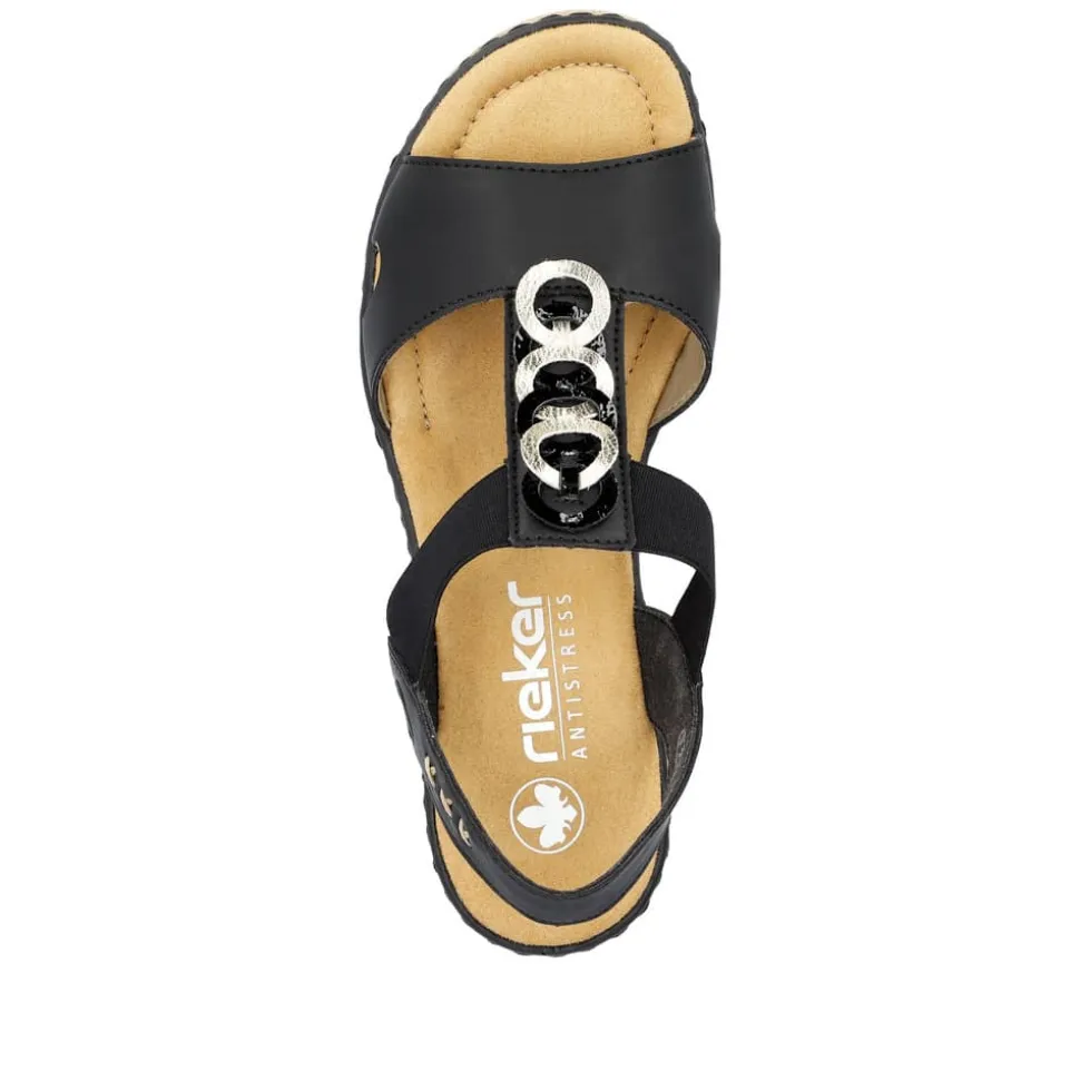 Rieker sandal til dame i sort. En fantastisk stilfuld sandal med en masse af smukke detaljer. Denne sandal er designet med en elastisk rem, der gør det legende let at glide i og ud af den. Med en skøn blød sål, der er udstyret med stødabsorberende egenskaber, sikrer den optimal komfort hele dagen. Med en hælhøjde på cirka 5 cm tilføjer den en elegant højde til dit look.