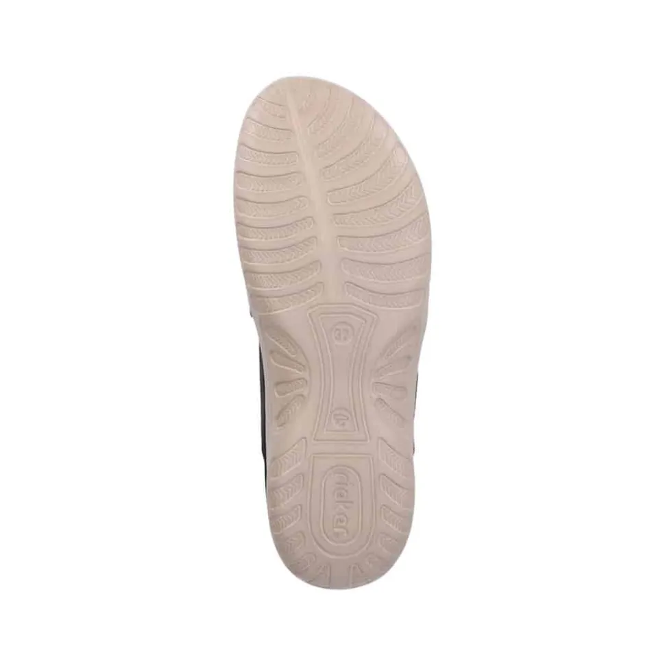 Rieker sandal til dame i sort. Denne lette sandal i sort kombinerer et klassisk udtryk med moderne detaljer. Tå-remmen giver et elegant og feminint look, mens slip-in funktionen gør det nemt at tage sandalen på. Indersålen er blød og sikrer komfort gennem hele dagen. Den solide ydersål med stødabsorbering og mønster giver både støtte og skridsikkerhed, hvilket gør sandalen perfekt til både hverdag og fritid.