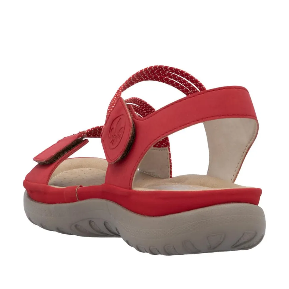 Rieker sandal i rød til dame. Rieker vandre-sandalen i rød er det perfekte valg til en aktiv hverdag. Den bløde sål og den fleksible EVA-sål sørger for god komfort hele dagen, mens de justerbare velcrolukninger og elastikken over vristen sikrer en nem og præcis pasform. Den lette og skridsikre sål gør sandalen perfekt til både lange gåture og afslappende stunder.