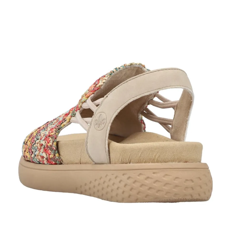 Rieker sandal til dame i farvekombination. Gå sommeren i møde med denne stilfulde og komfortable sandal i en smuk farvekombination. Den farverige vævede rem giver et unikt og moderne udtryk, mens den elastiske pasform sørger for, at sandalen sidder godt om foden. Den bløde indersål giver dejlig komfort, og den chunky ydersål med stødabsorbering sikrer en behagelig gang. Undersålen har et praktisk mønster, der giver øget støtte og skridsikkerhed.