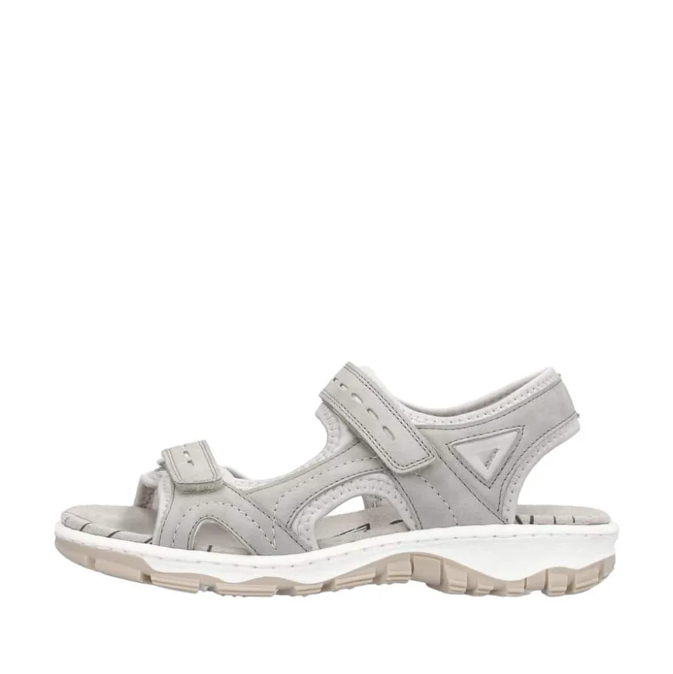 Rieker sandal til dame i grå. Denne fine sandal er lavet i en flot lys grå farve. Sandalen har to velcrolukninger, så den er nem at tilpasse foden. Dertil har sandalen rigtig gode stødabsorberende og fleksible antistress såler, som er med til at skabe en super god pasform og god komfort til fødderne. Sandalen har også en ydersål med et godt mønster der giver øget skridsikkerhed.