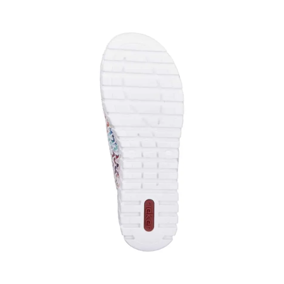 Rieker sandal til dame i hvid med farvekombination. Disse Rieker sandaler i flotte farver kombinerer smart design med velvære for fødderne. Den traditionelle forarbejdning gør dem fleksible og holdbare, og de justerbare velcroremme giver en pasform, der kan tilpasses individuelt. Den lette sål med kilehæl har stødabsorberende egenskaber, som gør sandalerne velegnede til både arbejde og fritid. Indersålen er ekstra blød, og den smalle pasform giver en sikker og behagelig støtte hele dagen.