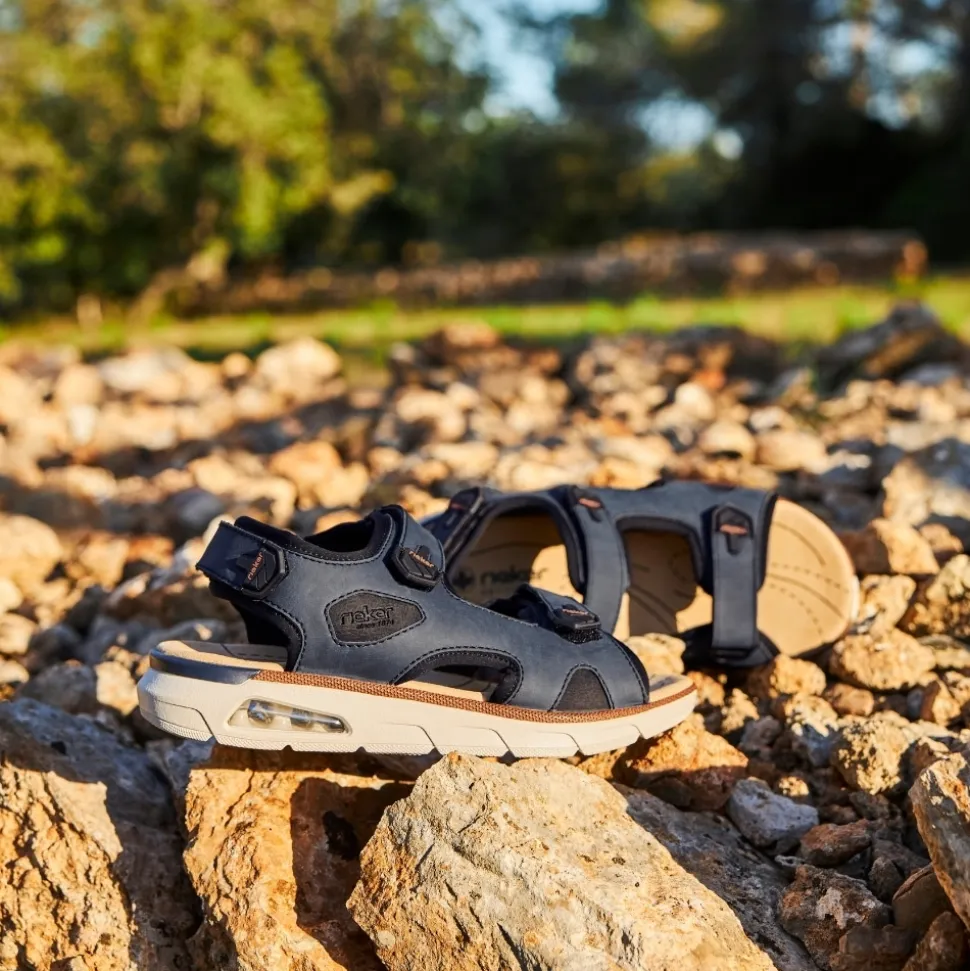 Rieker sandal til herre i blå. Disse blå trekkingsandaler fra Rieker kombinerer funktionalitet og komfort i et moderne design. De to justerbare velcroremme gør det nemt at tilpasse pasformen, så sandalen sidder behageligt hele dagen. Den stødabsorberende PU-sål med Rieker Air teknologi sikrer en blød gangoplevelse, mens den ekstra brede pasform (H) giver foden ekstra plads. Med et let og åndbart materiale er sandalen ideel til både daglig brug og rejser.