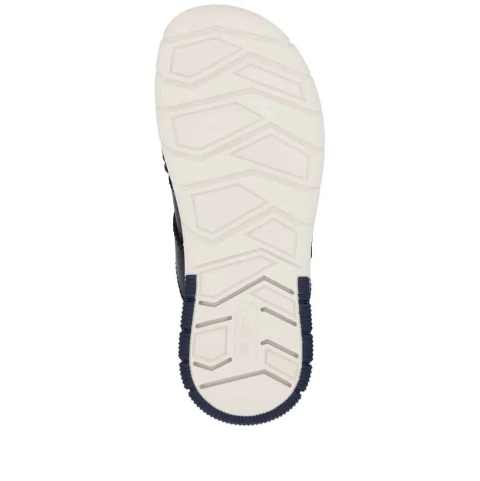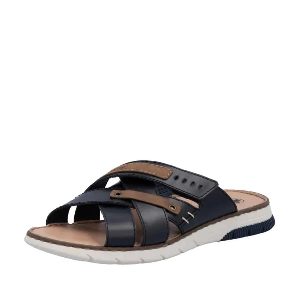 Rieker sandal til herre i blå. Disse Rieker sandaler til mænd tilbyder ikke kun en stilfuld påklædning, men også en uovertruffen komfort til hverdagen. Takket være den praktiske velcrolukning kan skoene let tages på. Deres åbne design og lette, støddæmpende sål sikrer kontinuerlig velvære. Med en ekstra blød indersål og en foring af åbencellet materiale, der effektivt absorberer fugt, giver disse sandaler dine fødder den bevægelsesfrihed og åndbarhed, de fortjener, hvilket gør dem ideelle til varme dage. Oplev en ny dimension af både stil og komfort med disse sandaler.