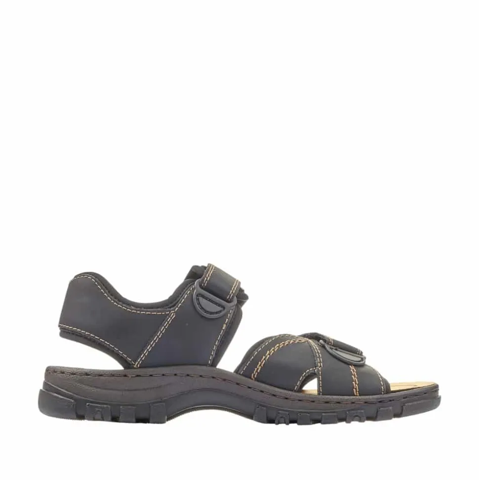 Rieker sandal i sort til herre. Denne sandal er det optimale valg for mænd, der søger stil, komfort og holdbarhed. Designet med fokus på detaljer og funktionalitet gør den ideel til afslappede sommerdage og udendørs eventyr. Det robuste design og kvalitetsmaterialer sikrer holdbarhed og alsidighed. Sandalen har gode stødabsorberende såler, som gør den super god at gå i. Dertil har sandalen en god pasform, og giver mulighed for at justere med de to velcro remme henover foden.