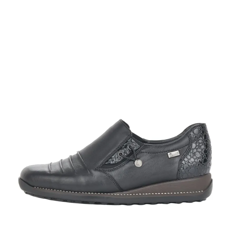 Rieker sko til dame i sort. Stilfuld Rieker sko til dame. Denne sko er udstyret med RiekerTex for vandafvisning. Skoen har en overdel i ægte læder, en stødabsorberende sål og er let og fleksibel. De elegante lakdetaljer på hælen skaber et stilfyldt design med flotte detaljer. Den praktiske elastikåbning gør det nemt at tage skoen af og på.