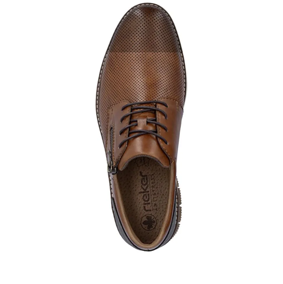 Rieker sko til herre i brun. Stilfulde brune sko i skind, der er designet med fokus på både funktion og komfort. Kombinationen af snørebånd og lynlås gør skoen nem at bruge i hverdagen og sikrer en god pasform. Indvendigt finder du en blød sål, som giver behagelig komfort dagen igennem. Med Rieker Antistress får du en let og fleksibel sko, og den mønstrede ydersål giver øget stødabsorbering og skridsikkerhed.