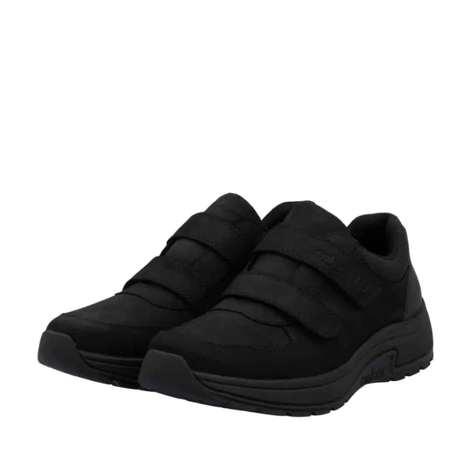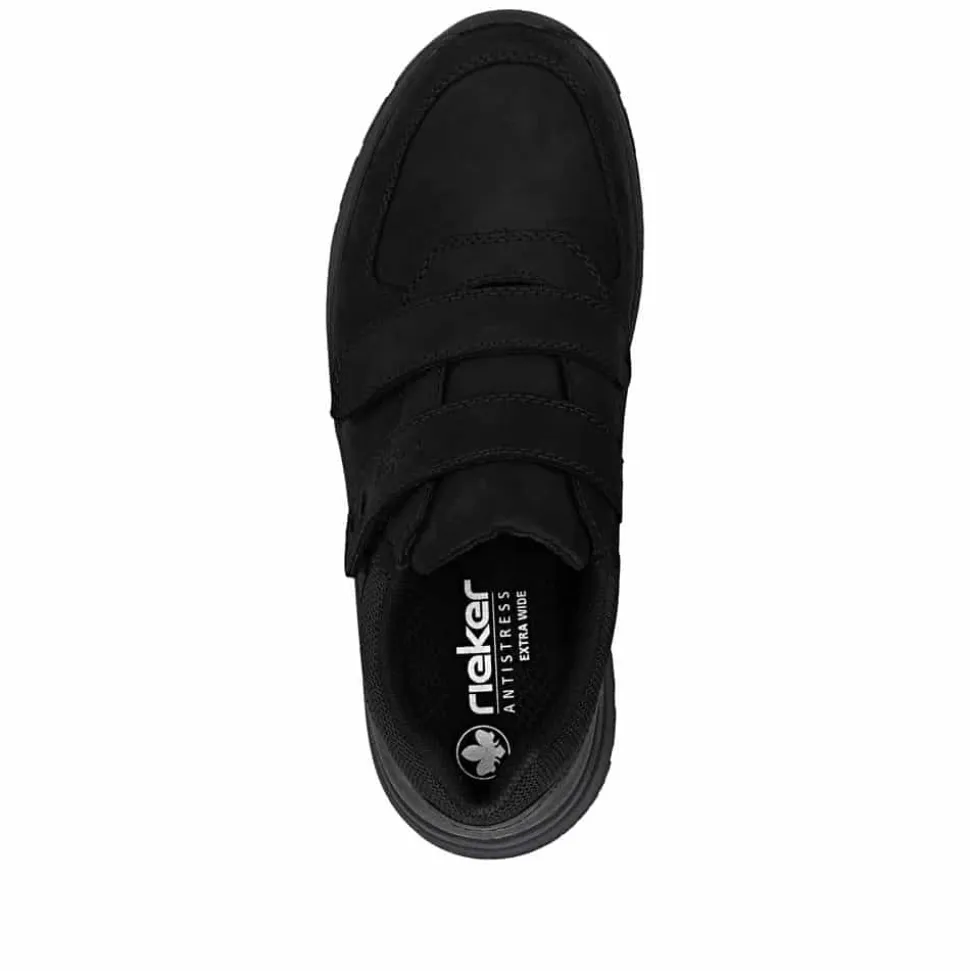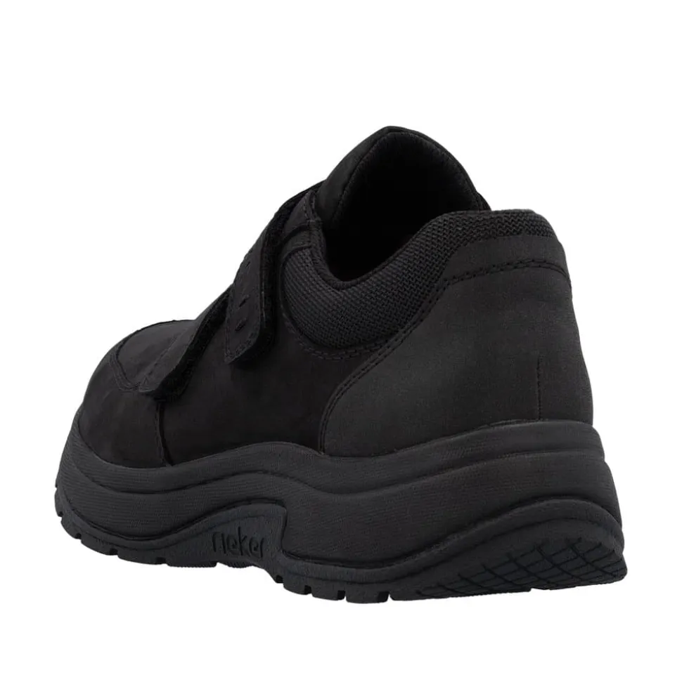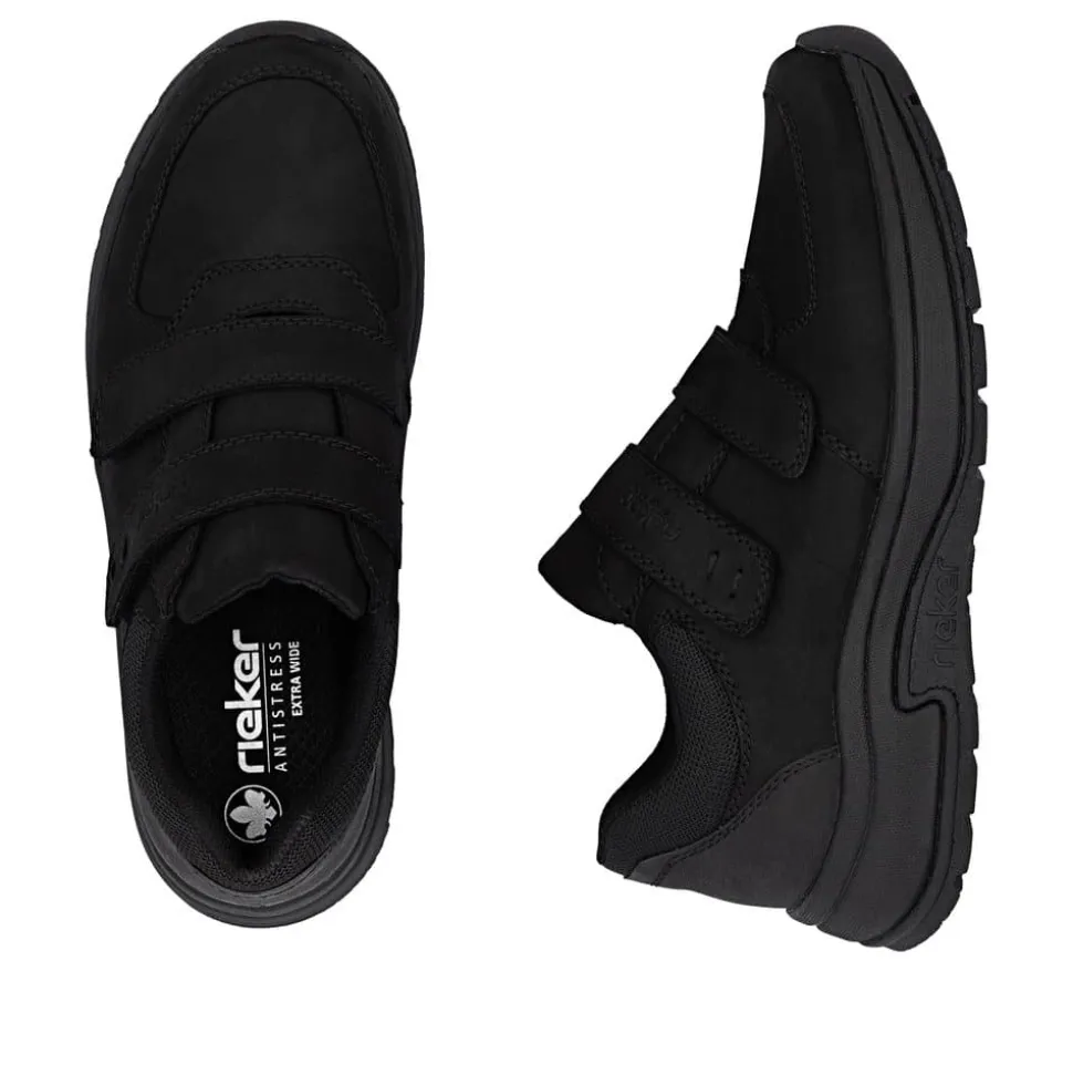 Rieker sko til herre i sort. Smarte herresko med en blød skindoverdel, der gør dem ideelle til hverdagsbrug. Modellen er udstyret med praktisk velcrolukning, så skoen er nem at tage af og på. Indvendigt finder du en blød udtagelig sål samt ekstra bredde (H), der giver både komfort og mere rummelighed til foden. Den mønstrede ydersål giver øget stødabsorberende og skridsikkerhed.