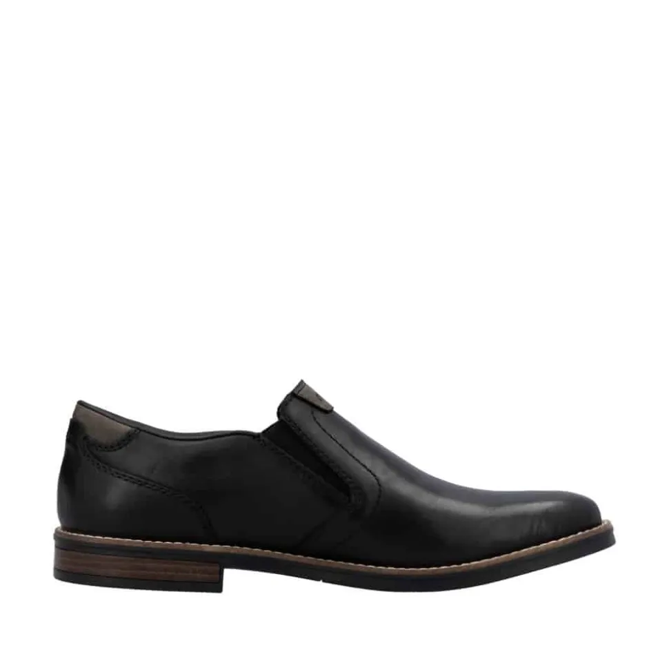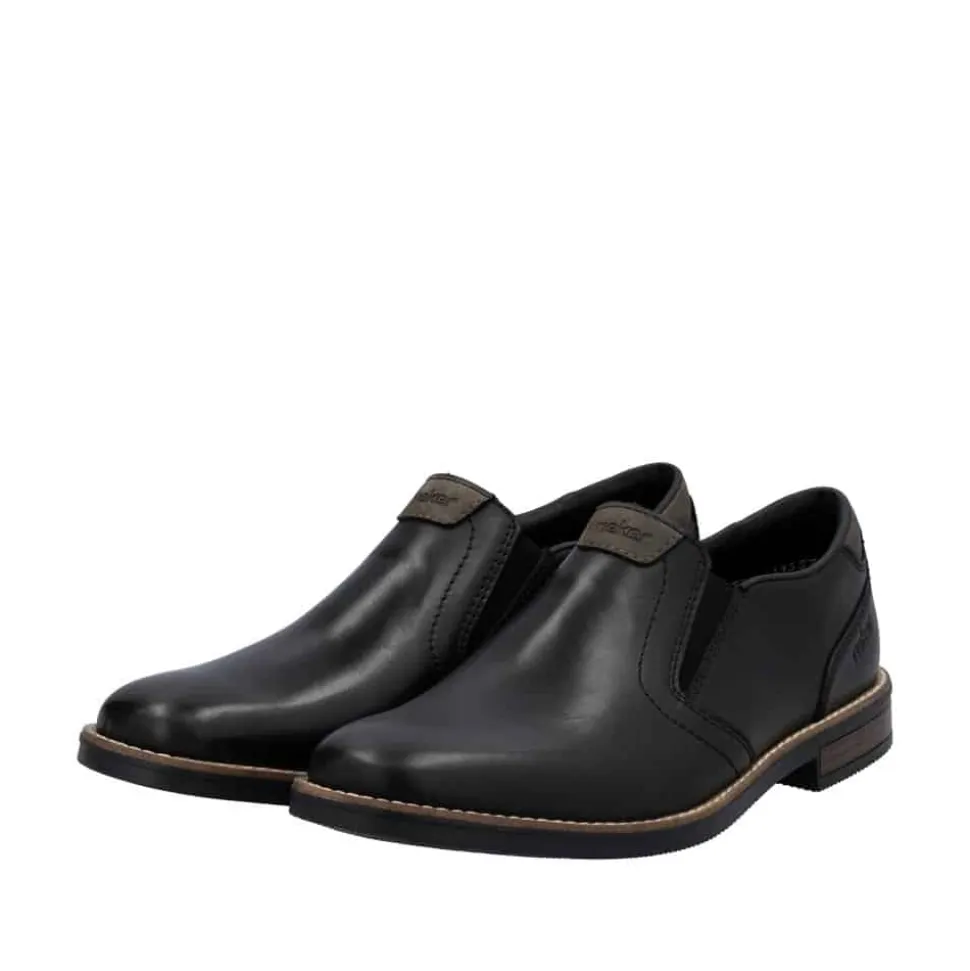 Rieker hyttesko til herre i sort. Denne stilfulde herresko fra Rieker er det ideelle valg til både hverdagsbrug og festlige anledninger. Overdelen i ægte læder giver skoen et eksklusivt look, mens den bløde læderindersål sikrer en komfortabel oplevelse hele dagen. De elastiske paneler i siderne gør det hurtigt og nemt at tage skoene af og på, samtidig med at de giver en fleksibel og tilpasset pasform. Den robuste ydersål i syntetisk materiale sikrer holdbarhed og et godt fodfæste. En klassisk og alsidig sko, der kombinerer elegance og funktionalitet perfekt.