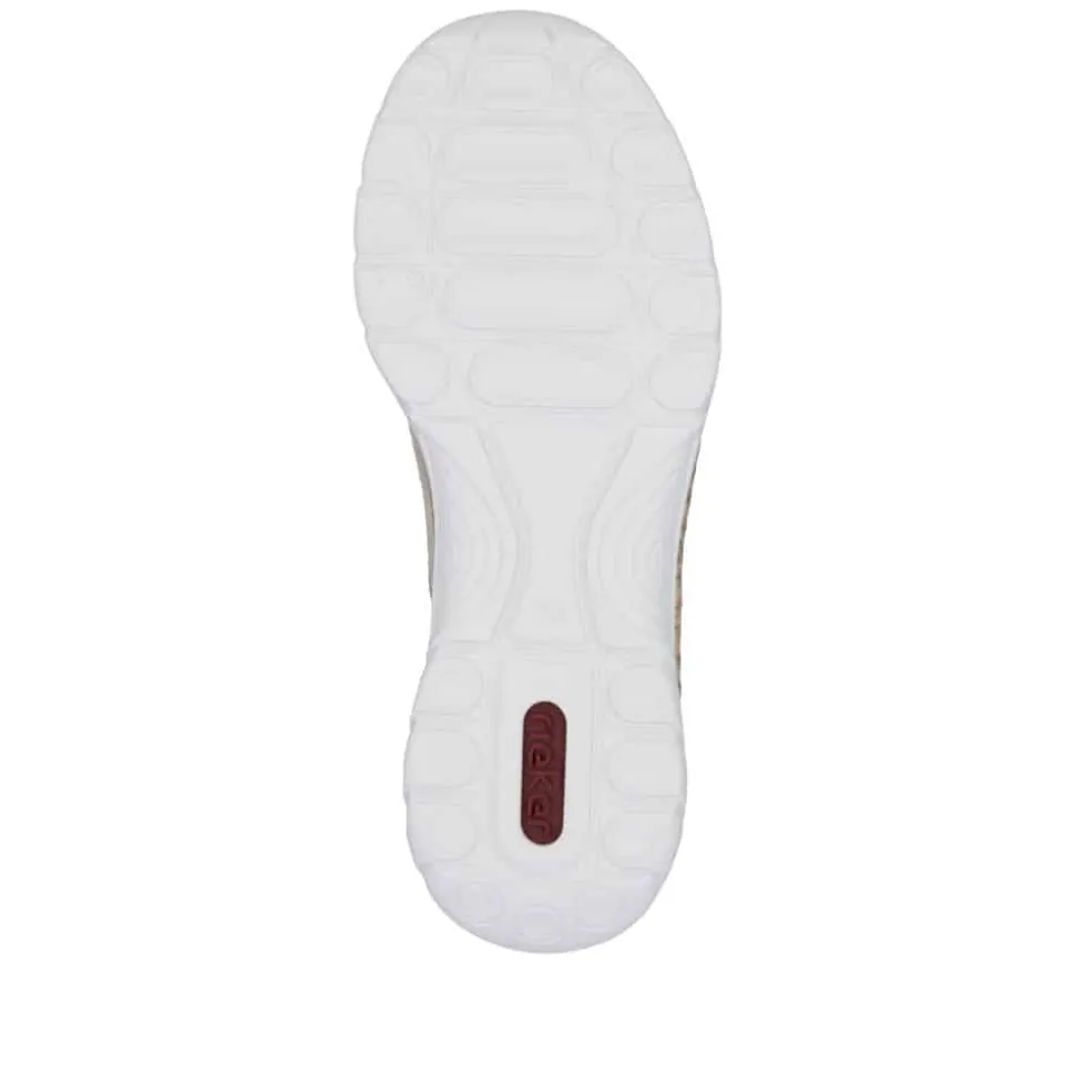 Rieker sneakers til dame i beige. Denne sneakers i beige giver din garderobe et friskt og stilfuldt pift. De fine detaljer og elastiksnørebåndet foran gør den både praktisk og moderne. Du kan nemt justere snørebåndene for en perfekt pasform, og den dekorative lynlås på ydersiden tilføjer et ekstra stilfuldt element. Indvendigt finder du en blød memosoft-sål, der sikrer komfort hele dagen. Skoen er også udstyret med stødabsorberende såler og et skridsikkert mønster under sålen for ekstra støtte og stabilitet hele dagen.