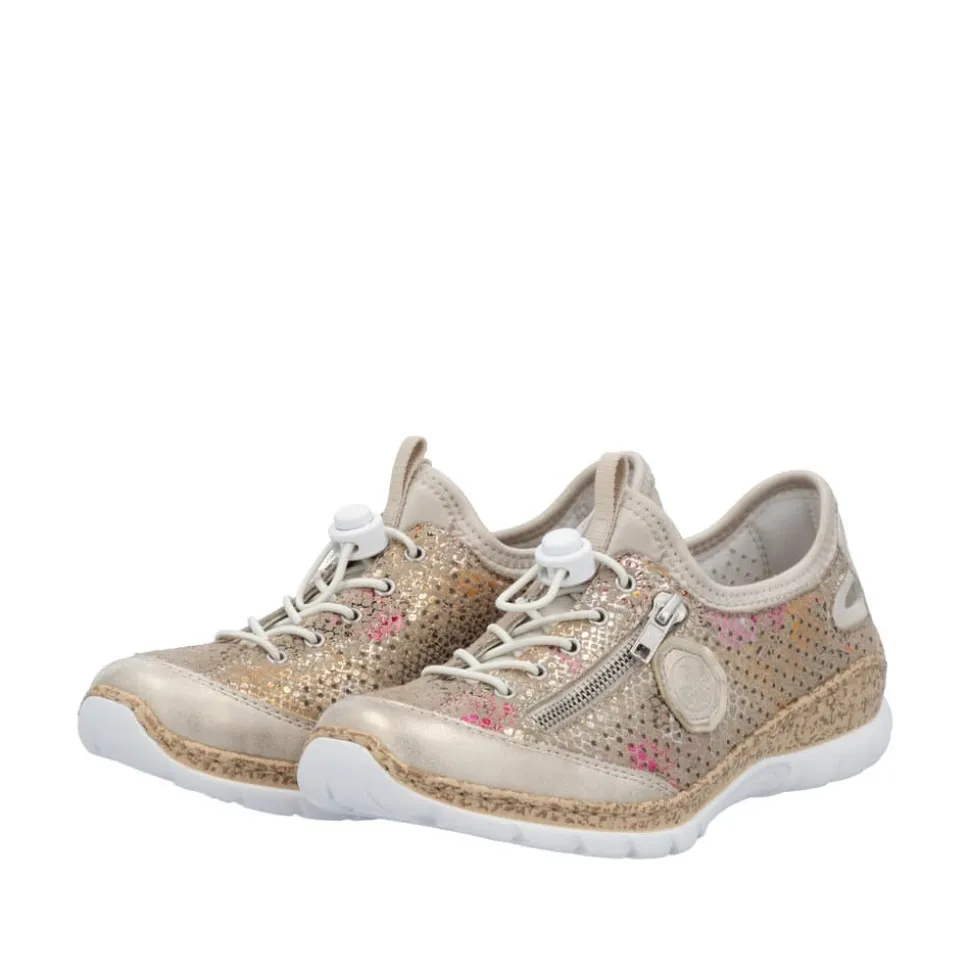 Rieker sneakers til dame i en smuk beige farvekombination. Denne elegante sneakers forener komfort og stil på bedste vis. Det gyldne slangemønster og pynte lynlåsen skaber et unikt look, mens den justerbare elastik foran sikrer en perfekt pasform. Indvendigt giver den bløde Memosoft sål behagelig støtte hele dagen, og den lette, stødabsorberende sål med kilehæl gør hvert skridt ekstra komfortabelt.