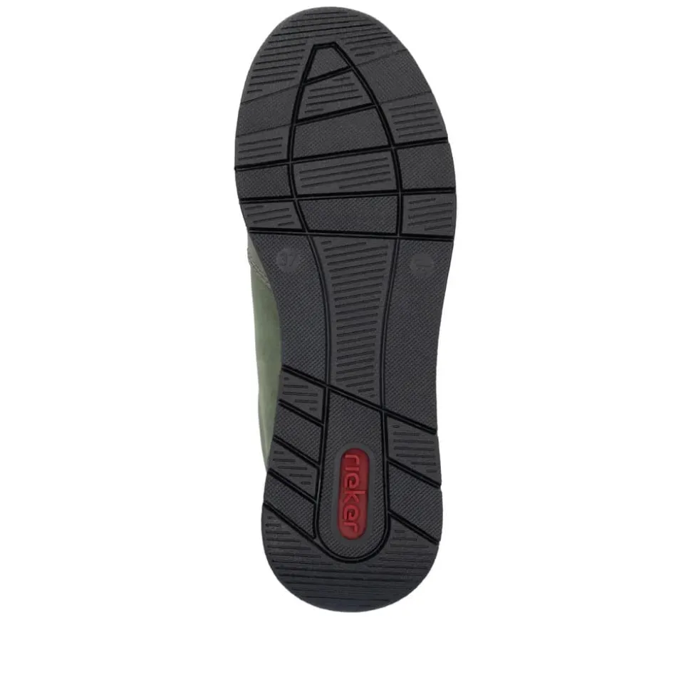 Rieker sneakers til dame i grøn. Let og fleksibel sneakers i en flot grøn farve med smarte detaljer, der giver et feminint udtryk. Skoene har både snørebånd og en lynlås i siden, så de er nemme at tage af og på. Indvendigt finder du en blød og udtagelig indersål, der giver komfort hele dagen. Den lette ydersål med Rieker Antistress-teknologi sikrer, at skoene er behagelige at bruge i hverdagen.