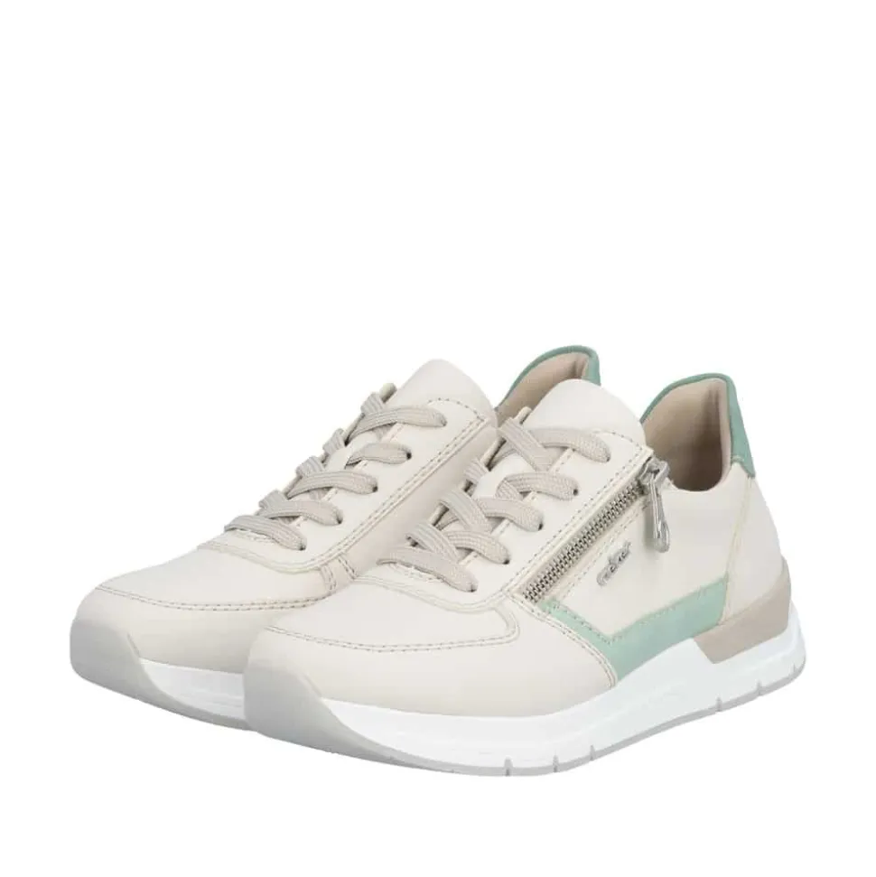 Rieker sneakers til dame i beige. Flot og moderne sko med grønne detaljer, der giver et friskt og stilfuldt udtryk. Skoen er udstyret med både snørebånd og en lynlås, som gør skoen nem at komme i og af. Indvendigt mødes du af en blød og udtagelig indersål, der giver behagelig komfort hele dagen. Den mønstrede ydersål giver øget stødabsorbering og skridsikkerhed i hvert skridt.