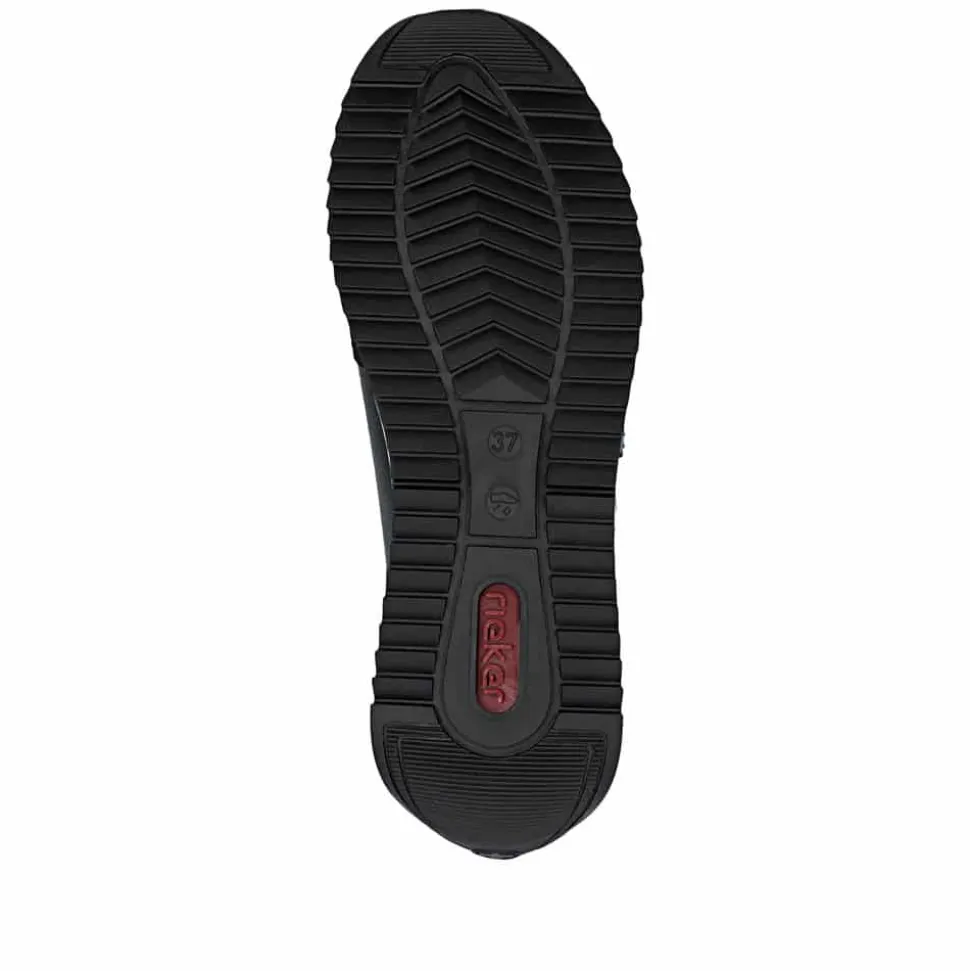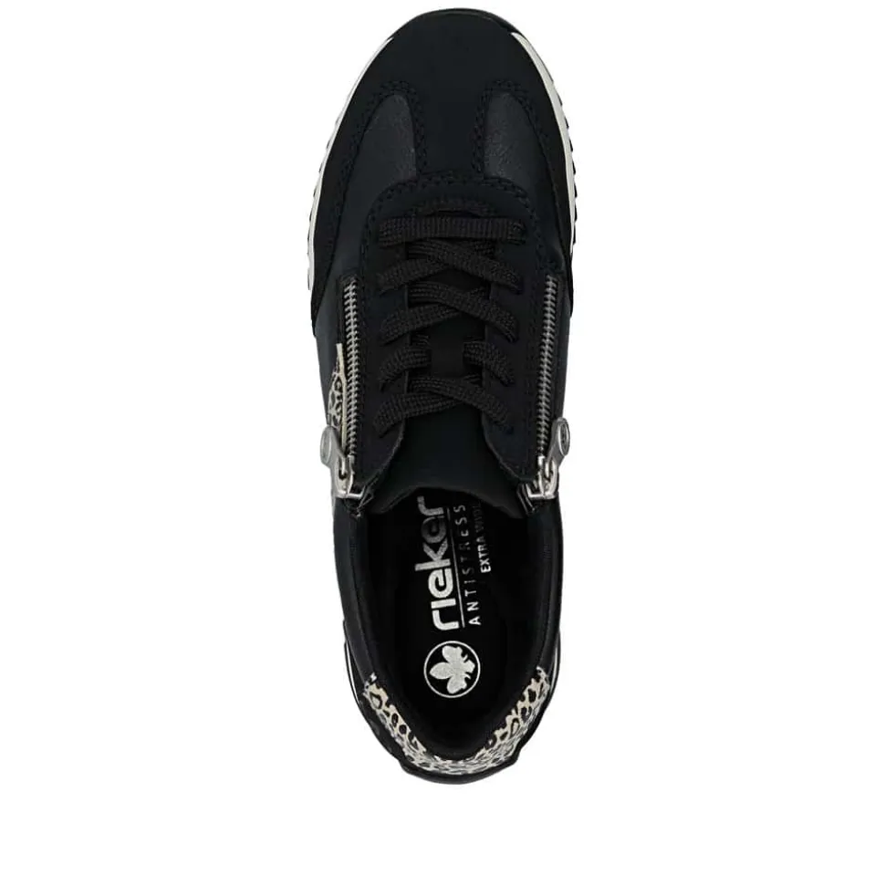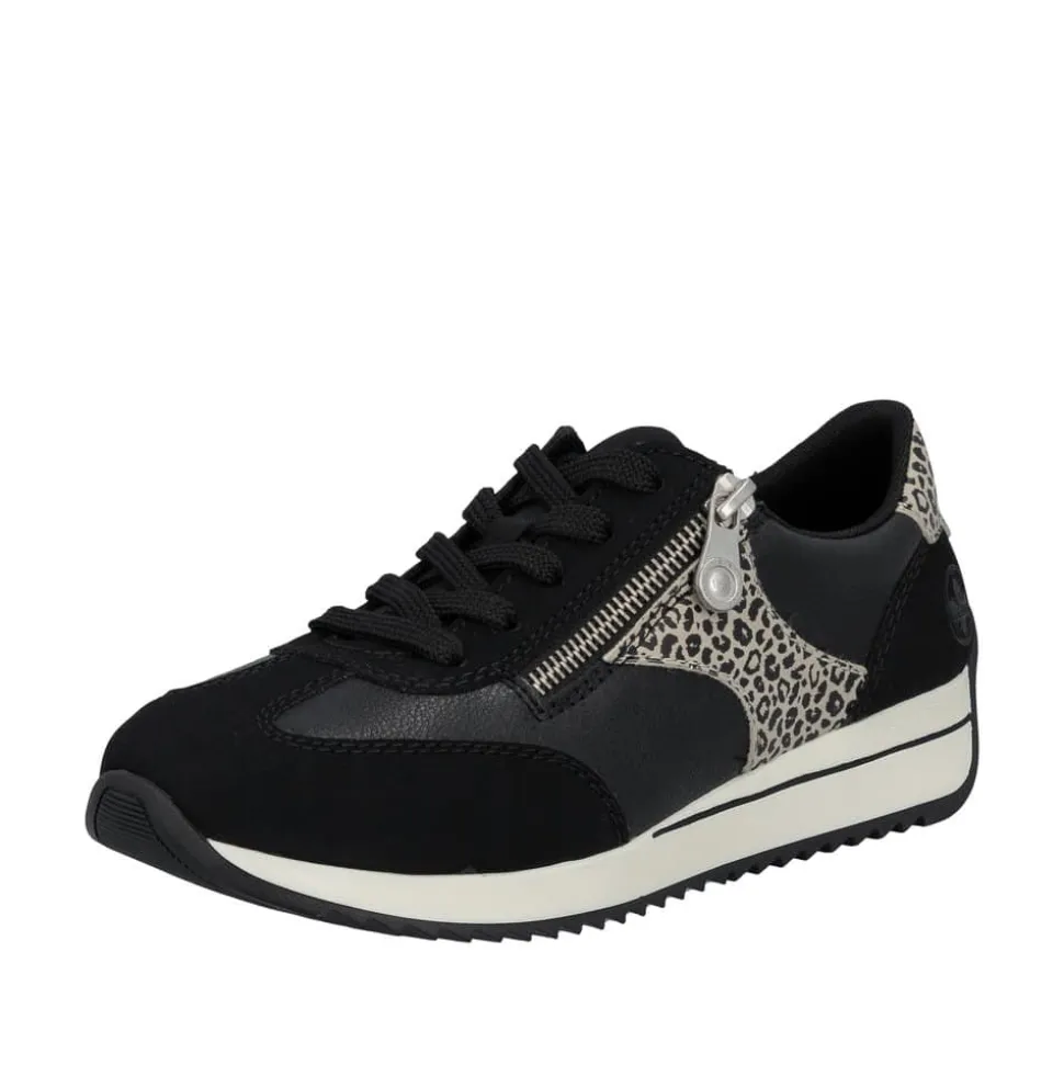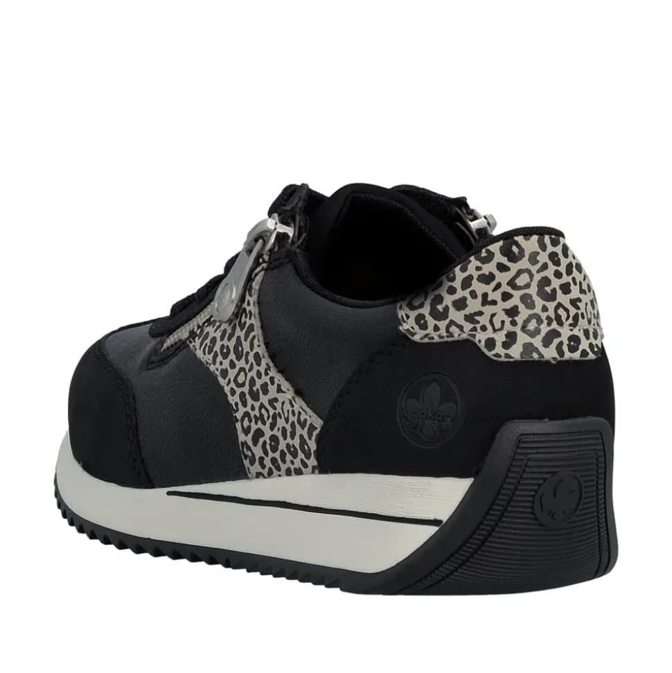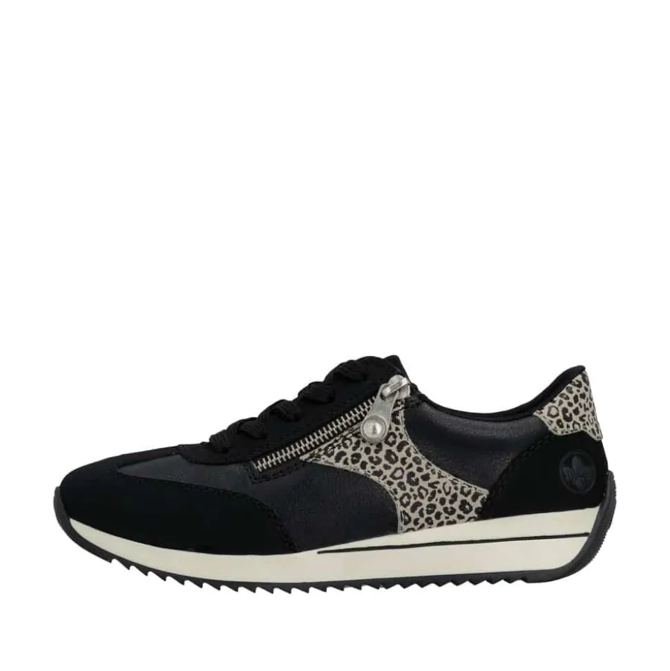 Rieker sneakers til dame i sort. Stilfulde sneakers med skindoverdel og moderne leoparddetaljer, der giver et feminint udtryk og et flot look. Snørebåndene sammen med de to funktionelle lynlåse gør skoen nem at justere, så den sidder behageligt på foden. Indvendigt har skoen en blød udtagelig sål og ekstra bredde (H), som sikrer god komfort dagen igennem og giver god plads til foden. Den mønstrede ydersål giver øget stødabsorbering og skridsikkerhed, så du får en stabil gang.