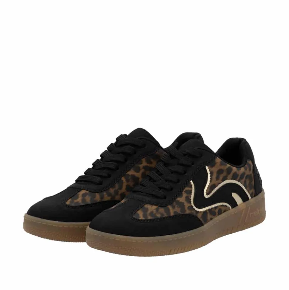 Rieker sneakers til dame i leopard. Trendy sneakers med leopardmønster og stilfulde sorte detaljer, der skaber et moderne look. Skoen har snørebånd, så du nemt kan justere pasformen til din fod. Indvendigt sikrer den bløde Rieker Soft indersål maksimal komfort, og den kan tages ud efter behov. Den lette og fleksible konstruktion kombineret med en stødabsorberende sål giver en behagelig oplevelse hele dagen.