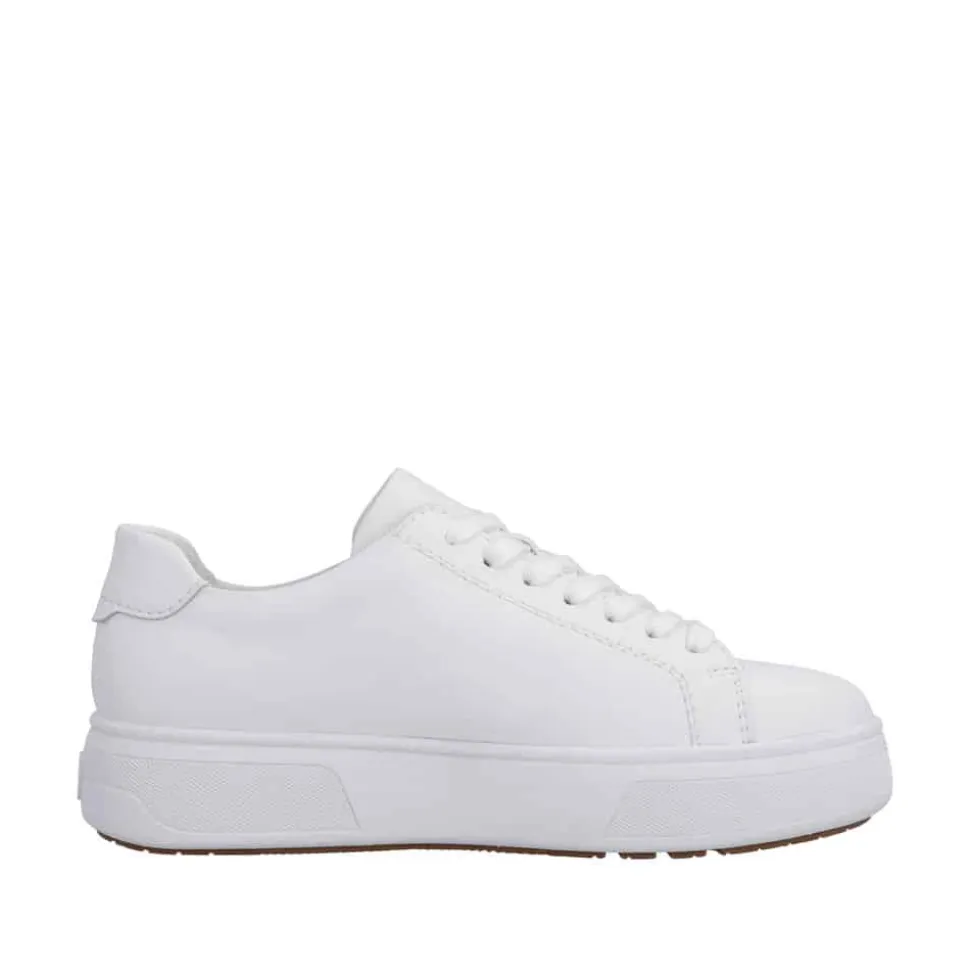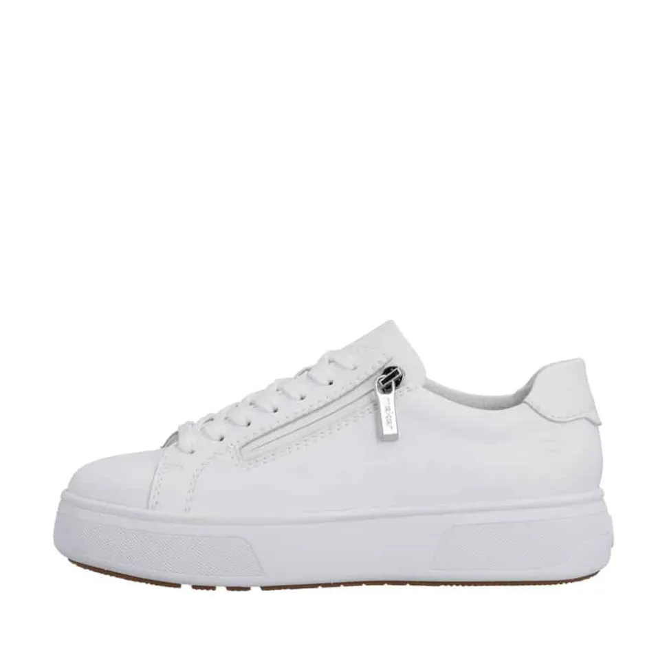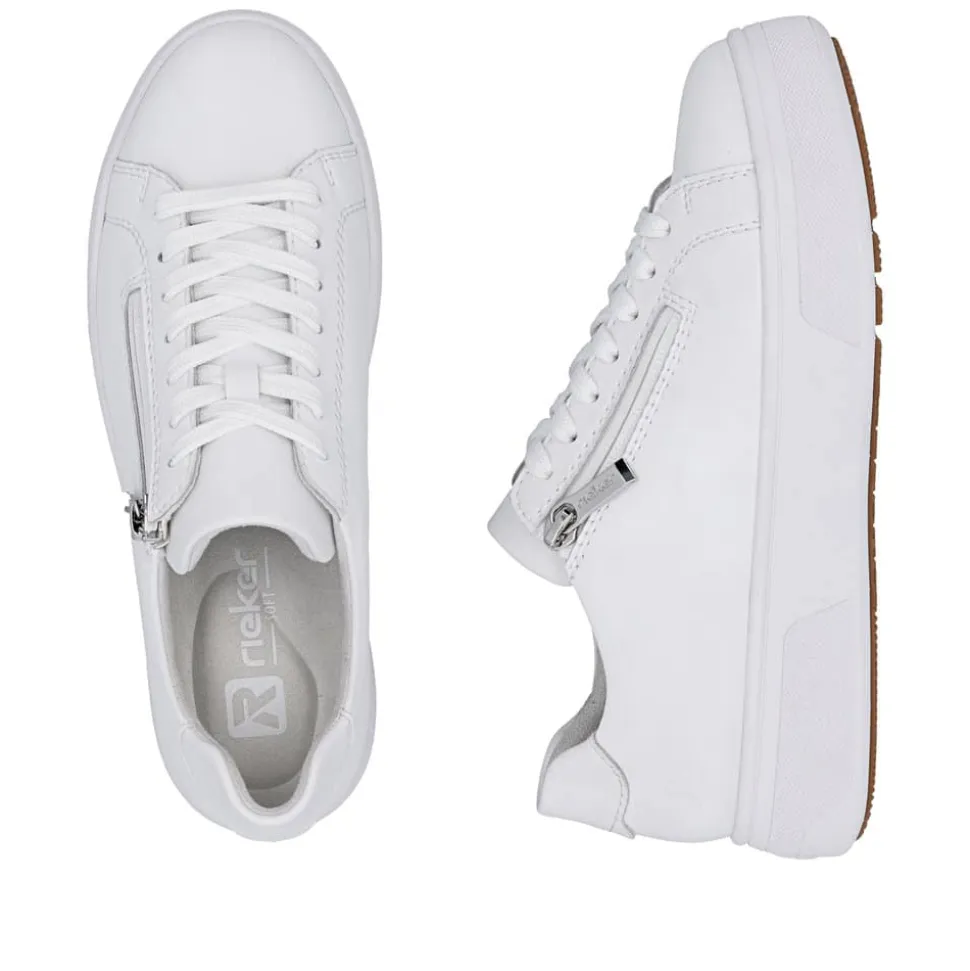 Rieker sneakers til dame i hvid. Stilfuld sneakers i hvid med et klassisk design og enkle detaljer. Kombinationen af snørebånd foran og en praktisk lynlås på ydersiden gør det let både at tilpasse pasformen og komme hurtigt i og af skoen. Indvendigt er skoen udstyret med en blød og udtagelig Rieker-Soft sål som giver behagelig komfort. Plateausålen på 4 cm. er designet med stødabsorbering, og ydersålen i gummi sikrer øget skridsikkerhed i hverdagen.