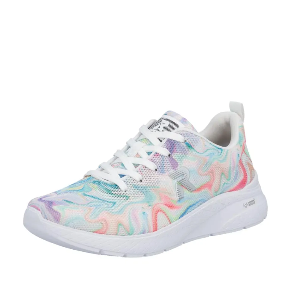 Rieker sneakers til dame i en flot farvekombination. Elegant sneakers med farverige detaljer der giver skoen ekstra strejf af stil. Skoen har snørebånd foran som gør det nemt at justere pasformen, og indvendigt mødes du af en blød og udtagelig Rieker-Soft så. Den lette og fleksible ydersål er designet med Rieker-Light+ og stødabsorbering for god komfort hele dagen.