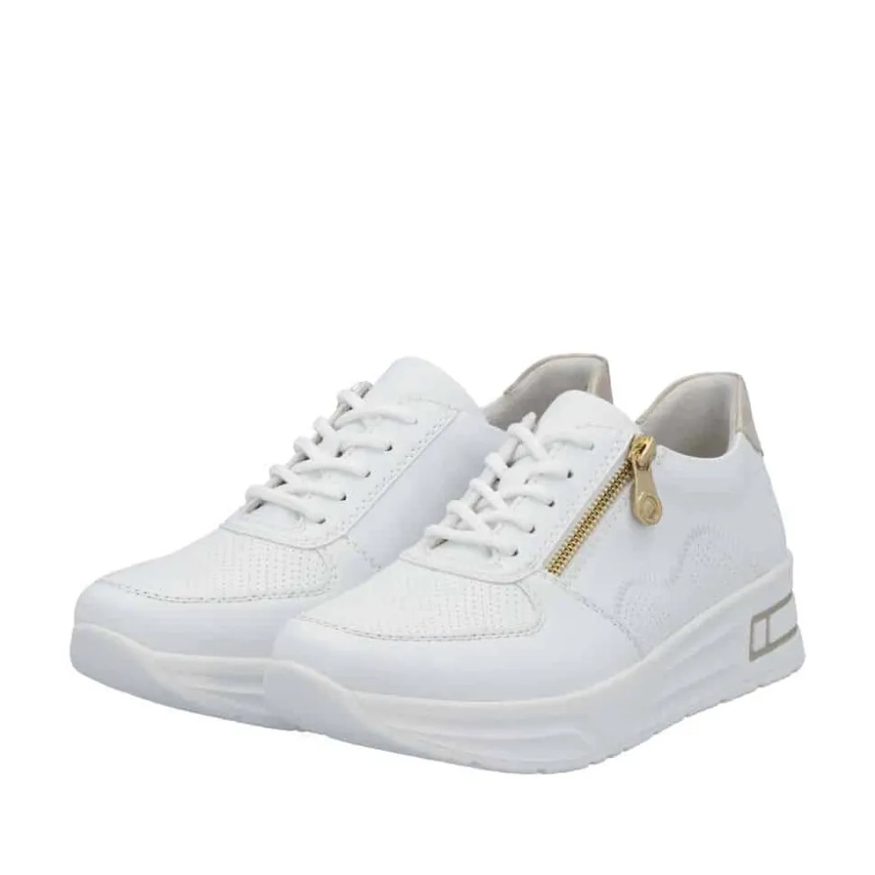 Rieker sneakers til dame i hvid. Træd ind i stil og komfort med denne elegante sneakers, der kombinerer en lav kilehæl for et subtilt løft og et flatterende udtryk – ideel til heldagsbrug. Kombinationen af snørebånd og lynlås sikrer en skræddersyet pasform og gør skoen nem at tage af og på. Den udtagelige Rieker Antistress-indlægssål former sig efter fodens kontur og giver fremragende stødabsorbering ved hvert skridt, mens den brede pasform i vidde H sikrer ekstra plads og komfort. Den moderne hvide overdel med smukke gulddetaljer tilføjer et stilfuldt præg til dit look. Skoen er fremstillet af slidstærkt syntetisk materiale med en åndbar tekstilforing, der holder fødderne friske hele dagen. Den lette og robuste syntetiske sål gør denne sneakers til det perfekte valg til både hverdagsbrug og aktive dage.