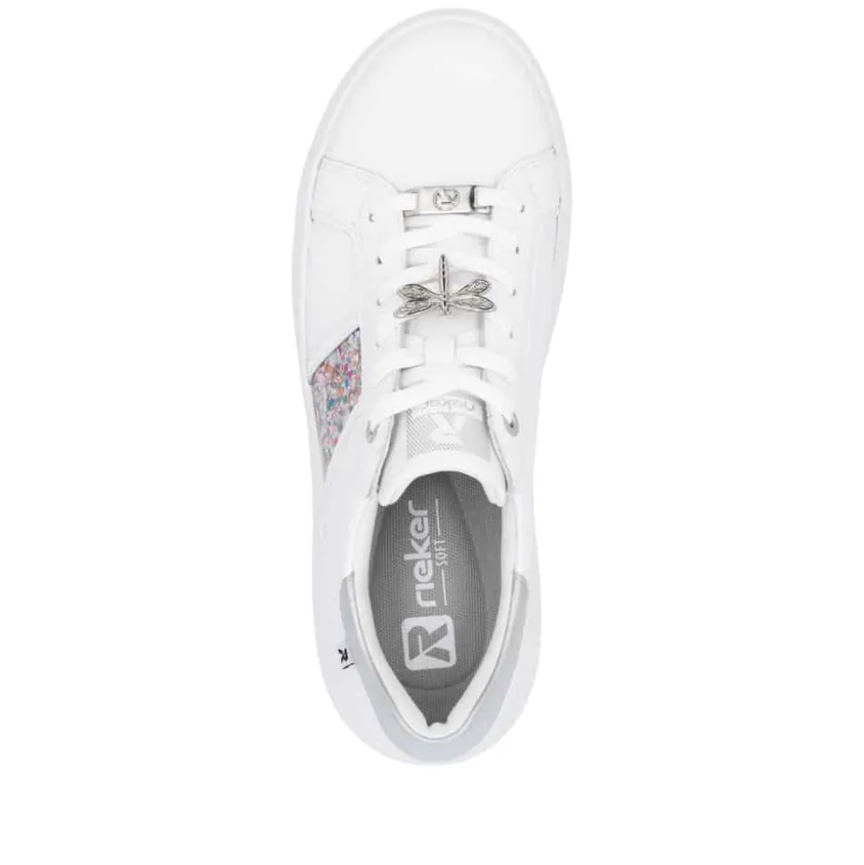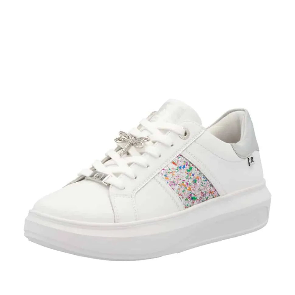 Rieker sneakers til dame i hvid. Disse elegante sneakers kombinerer stil og komfort med en eksklusiv skindoverdel og fine farvedetaljer på siden. Den lette og stødabsorberende sål giver en behagelig gangoplevelse hele dagen, mens den fleksible konstruktion gør dem perfekte til hverdagsbrug. Detaljer som en sølvfarvet stribe langs ydersiden og en raffineret guldsmeddetalje tilføjer et luksuriøst touch. De udtagelige indersåler med Rieker Soft-teknologi tilpasser sig foden for maksimal komfort, og den skridsikre TR-gummisål sikrer stabilitet og sikkerhed på alle underlag. Ideelle til både dagligdag og særlige lejligheder.