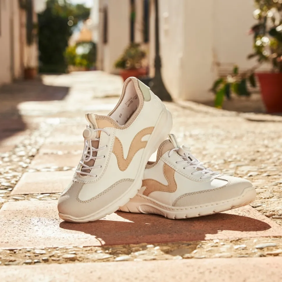 Rieker sneakers til dame i hvid. Denne lette og fleksible sneakers i en moderne hvid farve er fyldt med stilfulde detaljer, der giver et ekstra pift. Elastikken foran gør det nemt at tage skoene på, og den kan justeres, så pasformen passer perfekt til dine behov. Indvendigt finder du en blød memosoft-sål, der giver støtte og komfort hele dagen. Ydersålen er designet med stødabsorberende egenskaber og har et godt mønster, der øger skridsikkerheden.