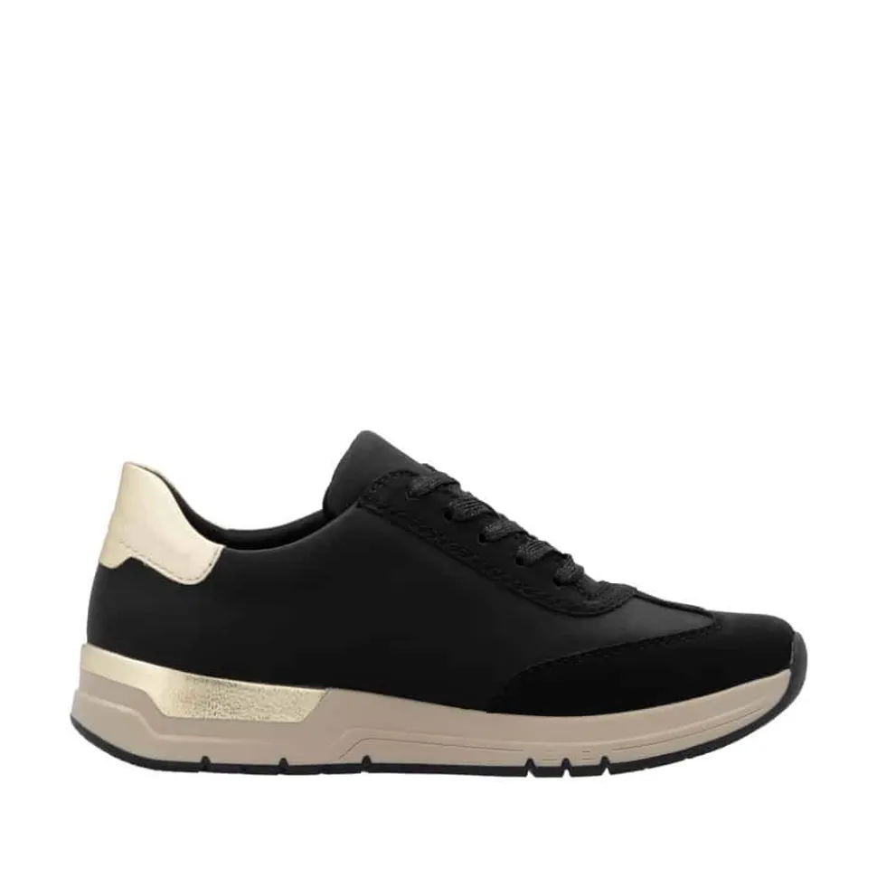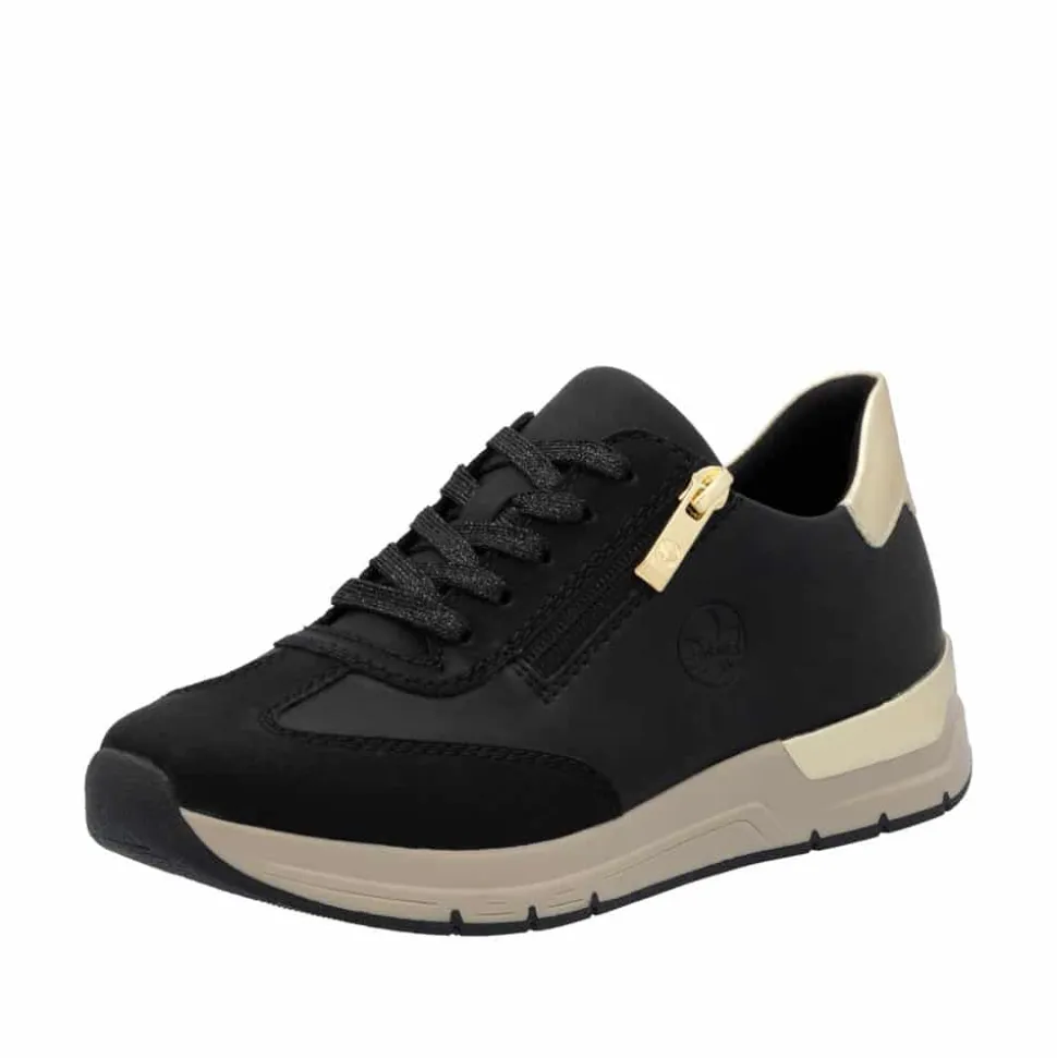 Rieker sneakers til dame i sort. Moderne sneakers i sort med flotte gulddetaljer og snørebånd med glimmer, der giver et feminint og stilfuldt udtryk. Skoen har både snørebånd og en praktisk lynlås i siden, så den er nem at tage af og på. Indvendigt bliver du mødt af en blød og udtagelig Rieker-soft sål, som giver god komfort dagen lang. Den lette og fleksible ydersål med stødabsorbering sikrer støtte og behagelig gang.