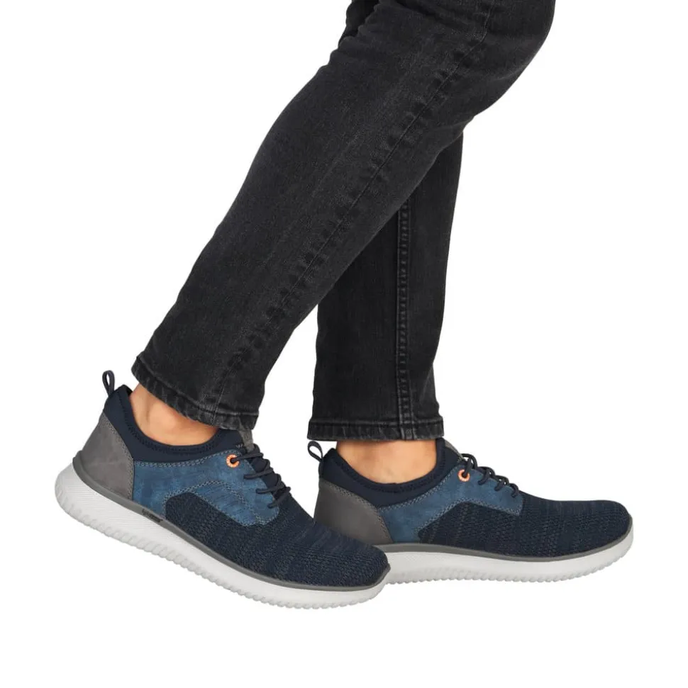 Rieker sneakers til herre i blå. Moderne sneakers til dig, der ikke vil gå på kompromis med hverken stil eller komfort. Modellen er udstyret med elastik foran, som giver en behagelig pasform og gør skoen nem i hverdagen. Indvendigt mødes foden af en blød sål samt ekstra bredde (G), der sikrer høj komfort og god rummelighed hele dagen. Ydersålen har et mønster, som giver øget stødabsorbering og skridsikkerhed ved hvert skridt.
