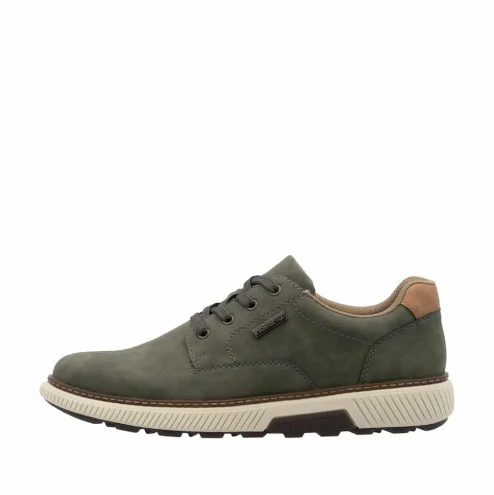 Rieker sneakers til herre i grøn. Disse grønne sneakers er et moderne valg med fokus på funktionalitet. De har snørebånd foran, som gør det nemt at tage skoen på og justere pasformen. Indvendigt finder du en blød, udtagelig indersål og ekstra bredde (H), der giver god plads til foden. Takket være Rieker Tex er skoen kraftigt vandafvisende, og ydersålen med stødabsorberende egenskaber giver ekstra støtte og komfort. Den mønstrede sål øger skridsikkerheden og giver stabilitet i hvert skridt.