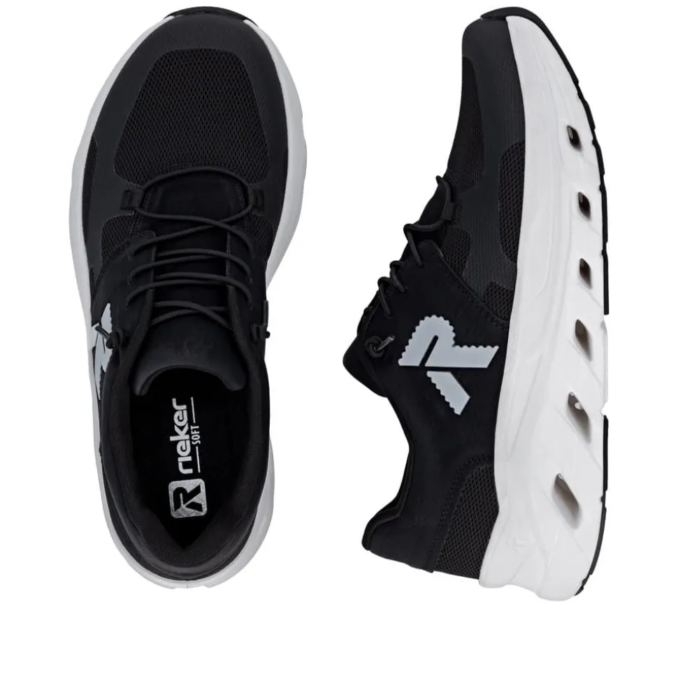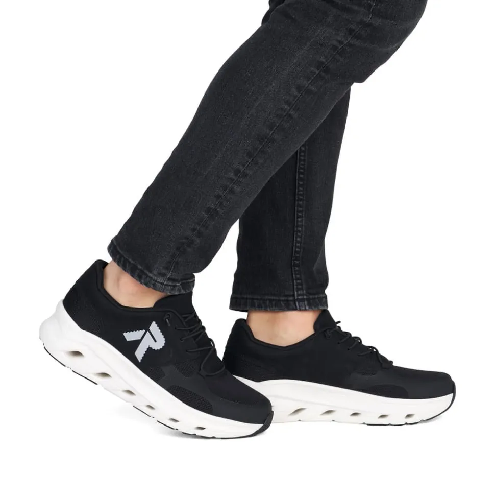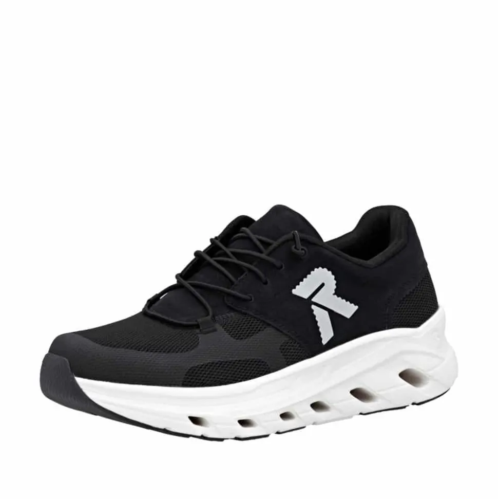 Rieker sneakers til herre i sort. Disse sorte sneakers kombinerer smart design med praktisk funktion. Skoen har elastik over vristen og leveres med snørebånd, så du selv kan vælge, hvad der passer bedst. Indvendigt finder du en blød og udtagelig Rieker-Soft indersål, der sikrer komfort hele dagen. Modellen har ekstra bredde (H), som giver god plads og fleksibilitet, mens den mønstrede ydersål bidrager med både øget stødabsorbering og skridsikkerhed.