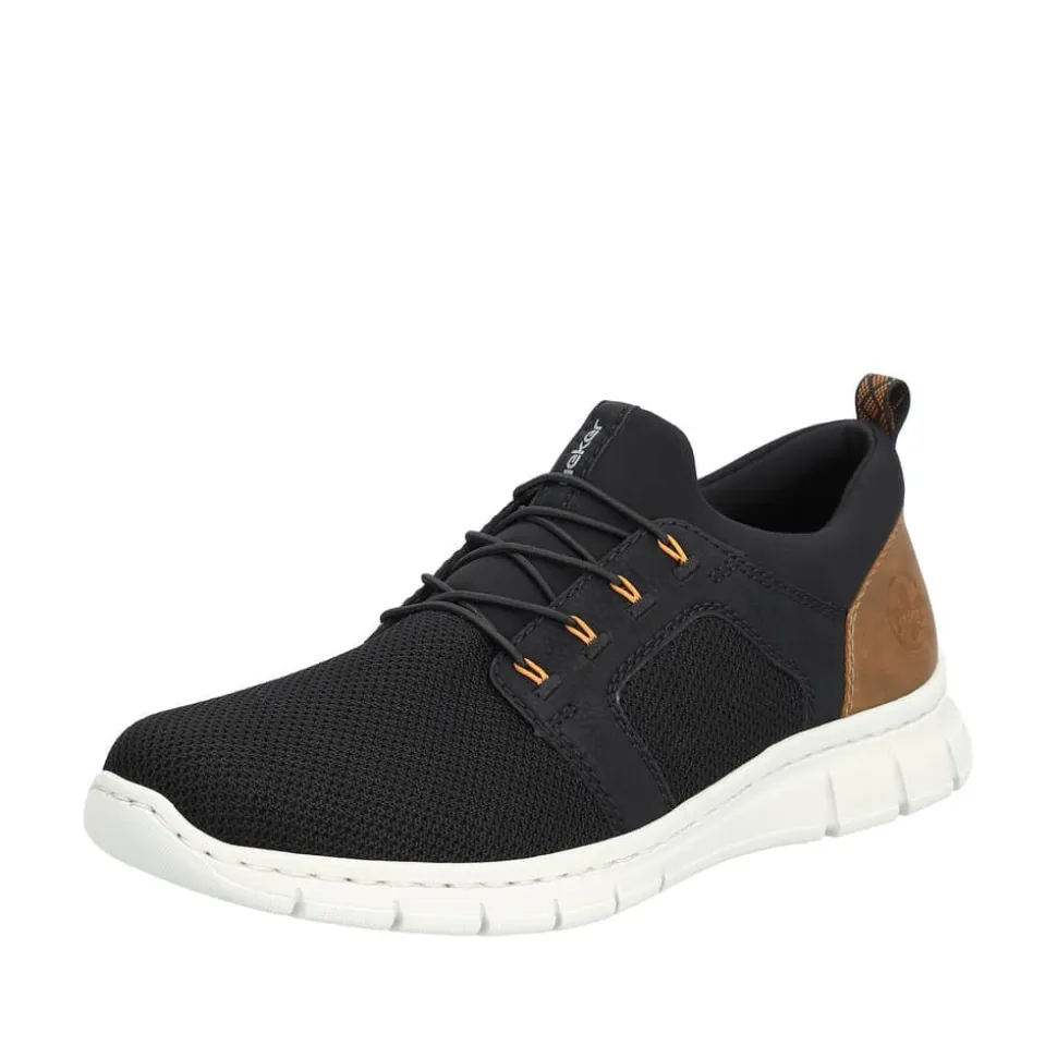 Rieker sneakers til herre i sort. Disse sorte Rieker sneakers til herrer er designet med elastiksnøre over vristen, hvilket gør dem både praktiske og moderne. Som en letvægtssneakers fra Rieker føles de så lette, at du næsten ikke bemærker, du har dem på. Modellen er udstyret med en brun hælkappe og en grå sål, der ikke kun er let og komfortabel, men også har stødabsorberende egenskaber, som giver optimal komfort dagen igennem. De orange detaljer langs elastikbåndene tilføjer et stilfuldt og sporty præg, der gør disse sneakers til et perfekt valg for den stilbevidste mand.