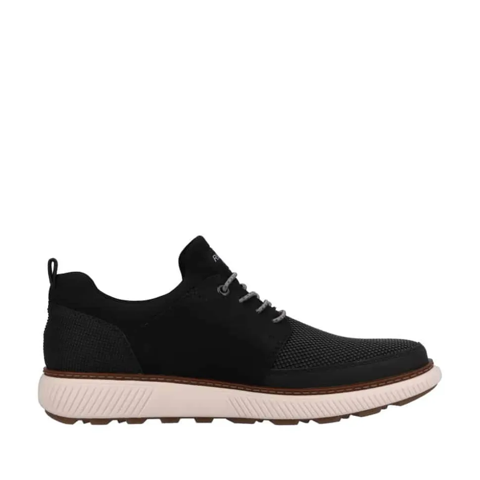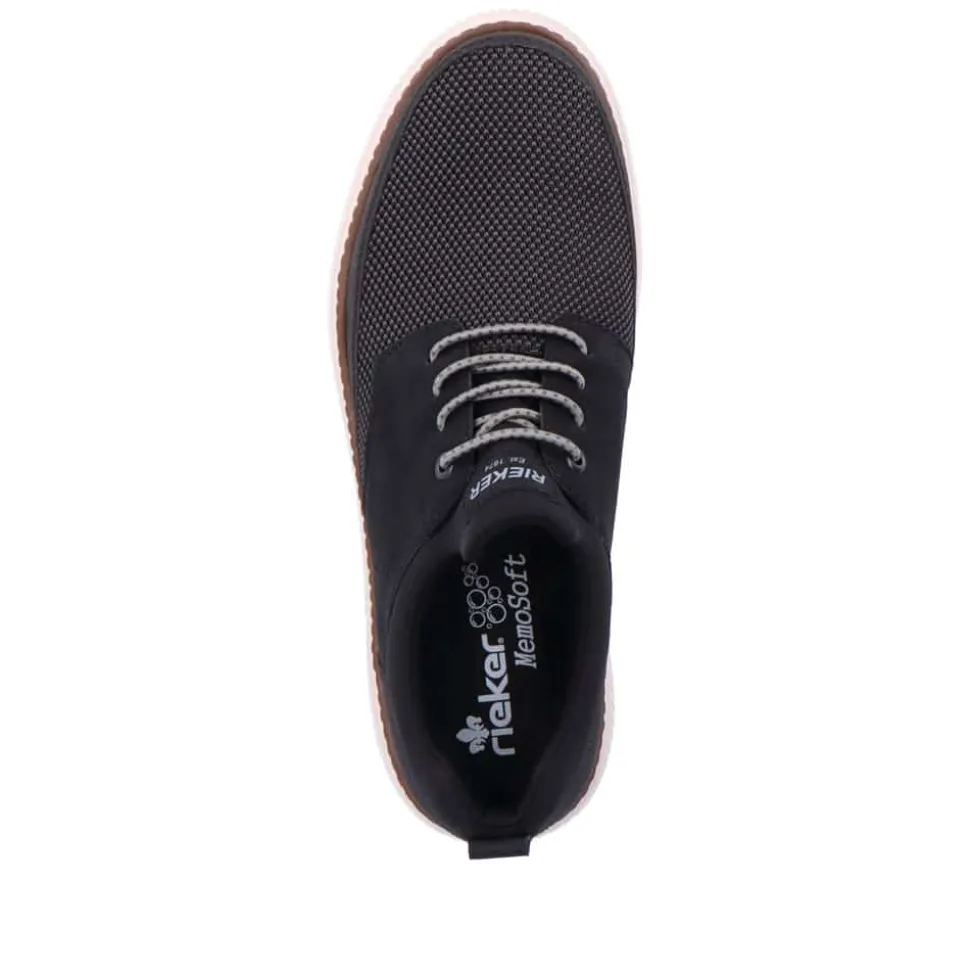 Rieker sneakers til herre i sort. Disse sorte Rieker sneakers til mænd kombinerer ikke kun stil med elegance, men sikrer også en enestående komfort i dagligdagen takket være deres høje kvalitet. Den praktiske elastiske snøring gør det nemt at tage skoene af og på uden besvær. Den lette og skridsikre sål gør hvert skridt til en sikker fornøjelse. Disse sneakers får ekstra pluspoint med en polstret og aftagelig indlægssål. Skoen er designet med ekstra bredde (H), der giver tilstrækkelig plads til foden, og de stødabsorberende såler aflaster hvert enkelt skridt.