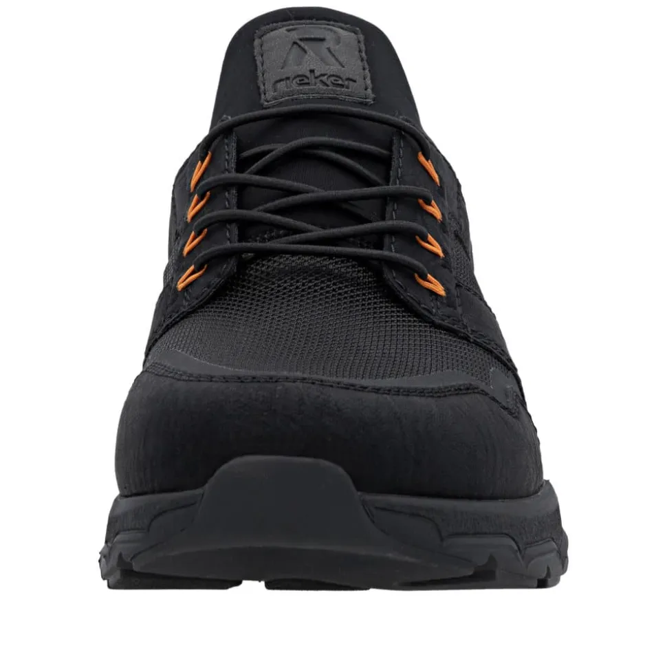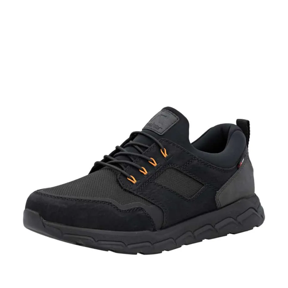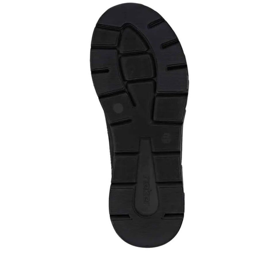 Rieker Sneakers til herre i sort. Disse sorte herresneakers kombinerer moderne design med praktisk funktion. Skoen har elastik over vristen, som gør den nem at tage af og på, samtidig med at den giver en god pasform. Indvendigt finder du en blød og udtagelig Rieker Soft-indersål, der sikrer komfort hele dagen. Med Rieker-Tex er skoen kraftigt vandafvisende, og den ekstra bredde (H) giver mere plads og fleksibilitet. Den lette ydersål har et mønster, der øger både stødabsorbering og skridsikkerhed.
