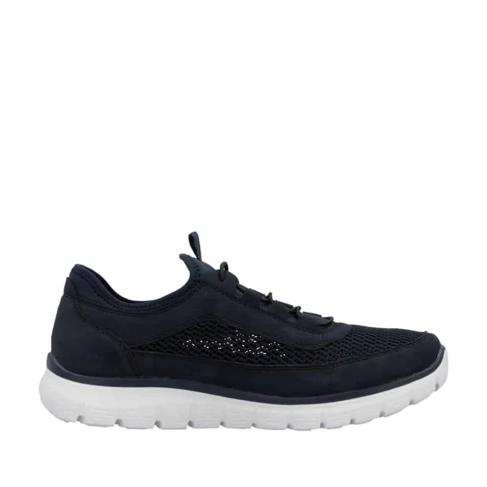 Rieker sneakers til herre i blå. Rieker har designet denne herre sneakers med fokus på funktionalitet og komfort. Skoen er nem at tage på takket være elastikken i åbningen og det smarte elastikbånd, som erstatter traditionelle snørebånd. Overdelen i åndbart mesh holder dine fødder friske, og den lette sål med Riekers velkendte stødabsorbering sørger for optimal komfort hele dagen.